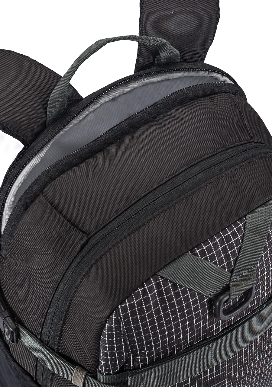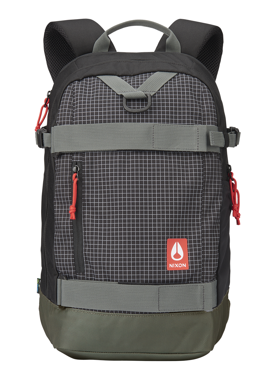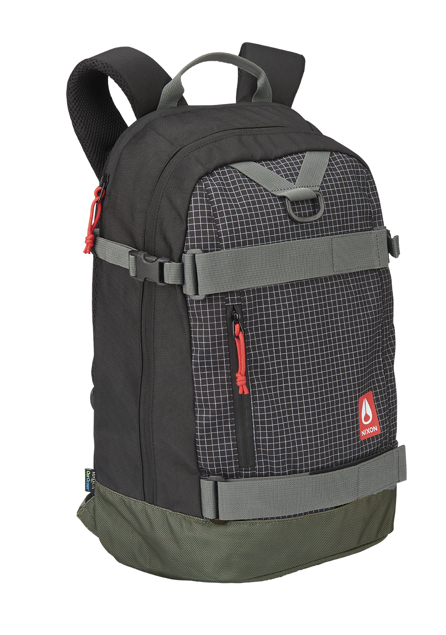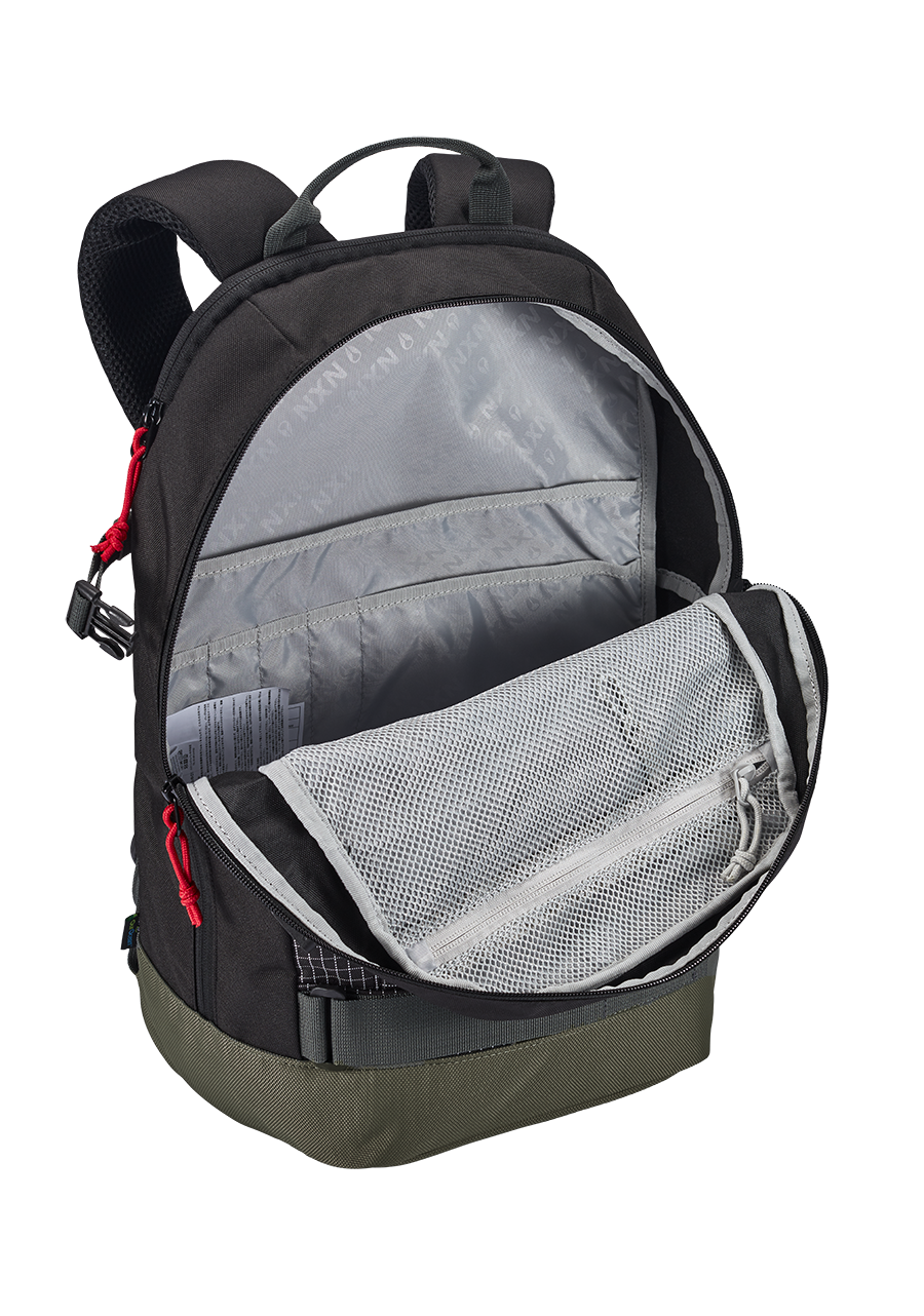 Grand compartiment principal avec poches internes d’organisation. Housse pour ordinateur portable (15") avec accès par fermeture éclair externe. Sangles externes pour skateboard, poche pour bouteille d’eau, poche fourre-tout zippée et boucle multifonction. Petite poche amovible en maille attachée à la bandoulière, taille idéale pour un petit flacon de désinfectant pour les mains.