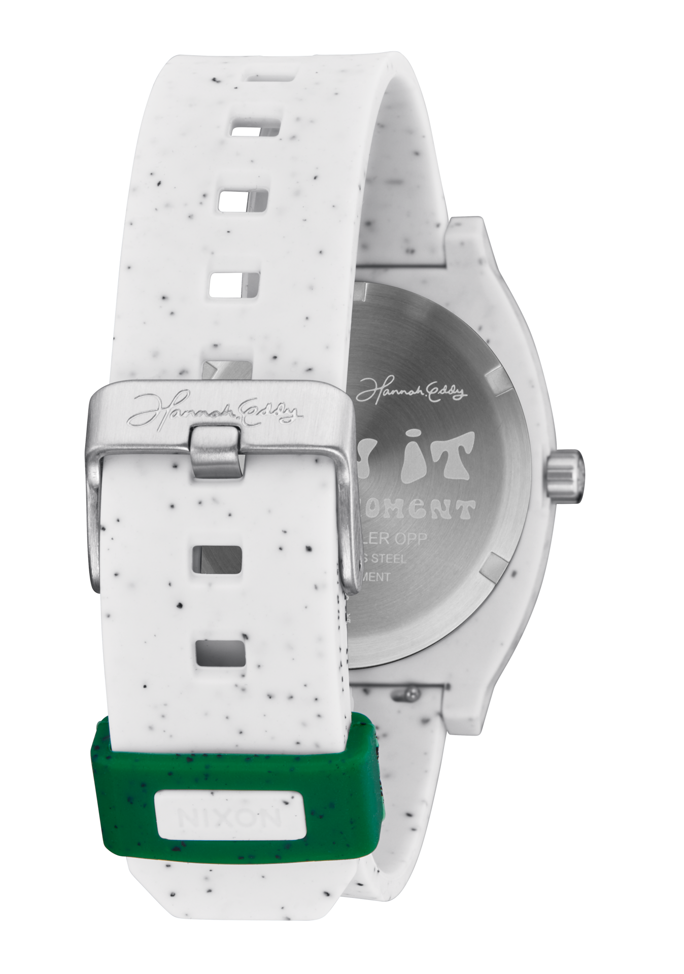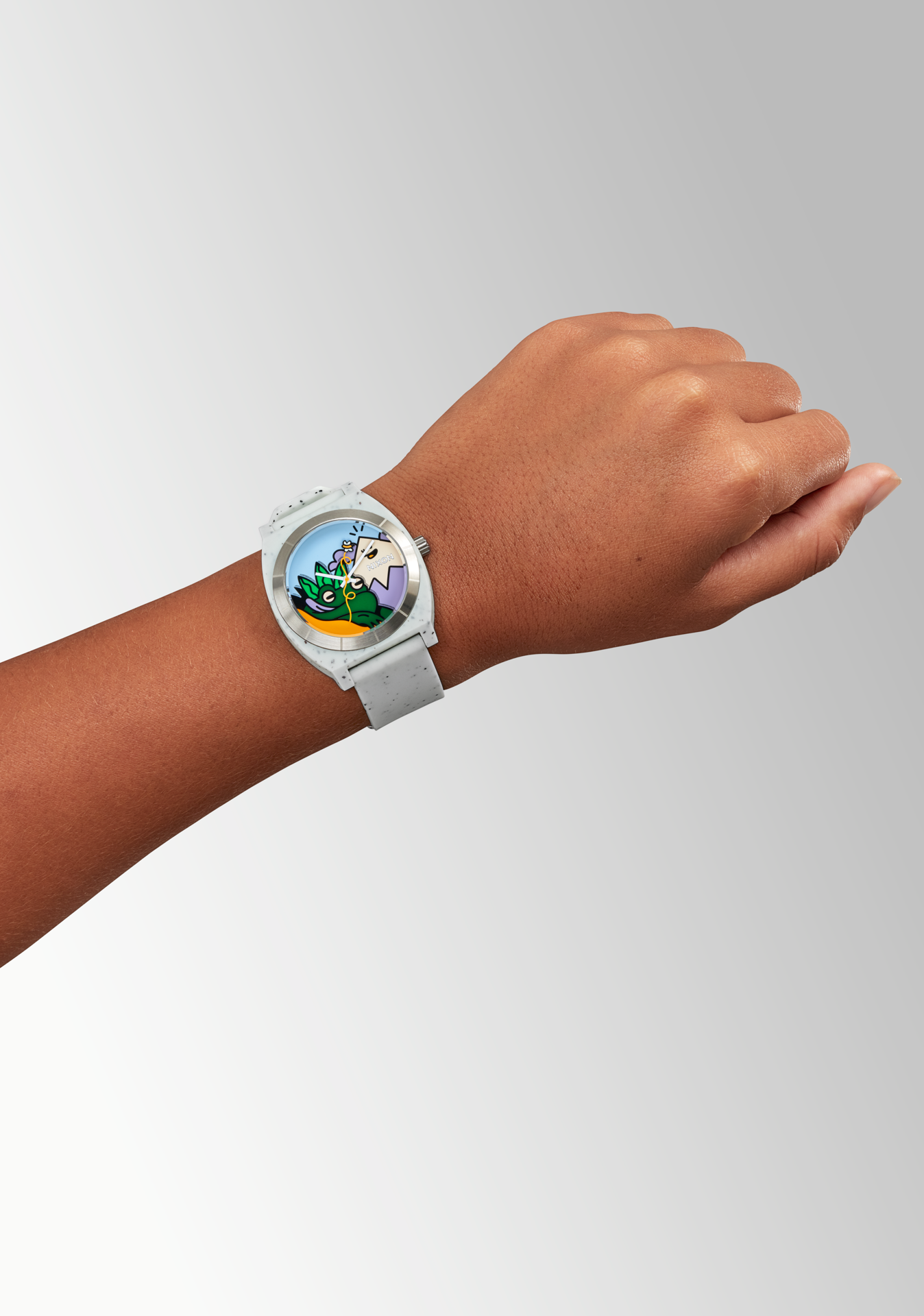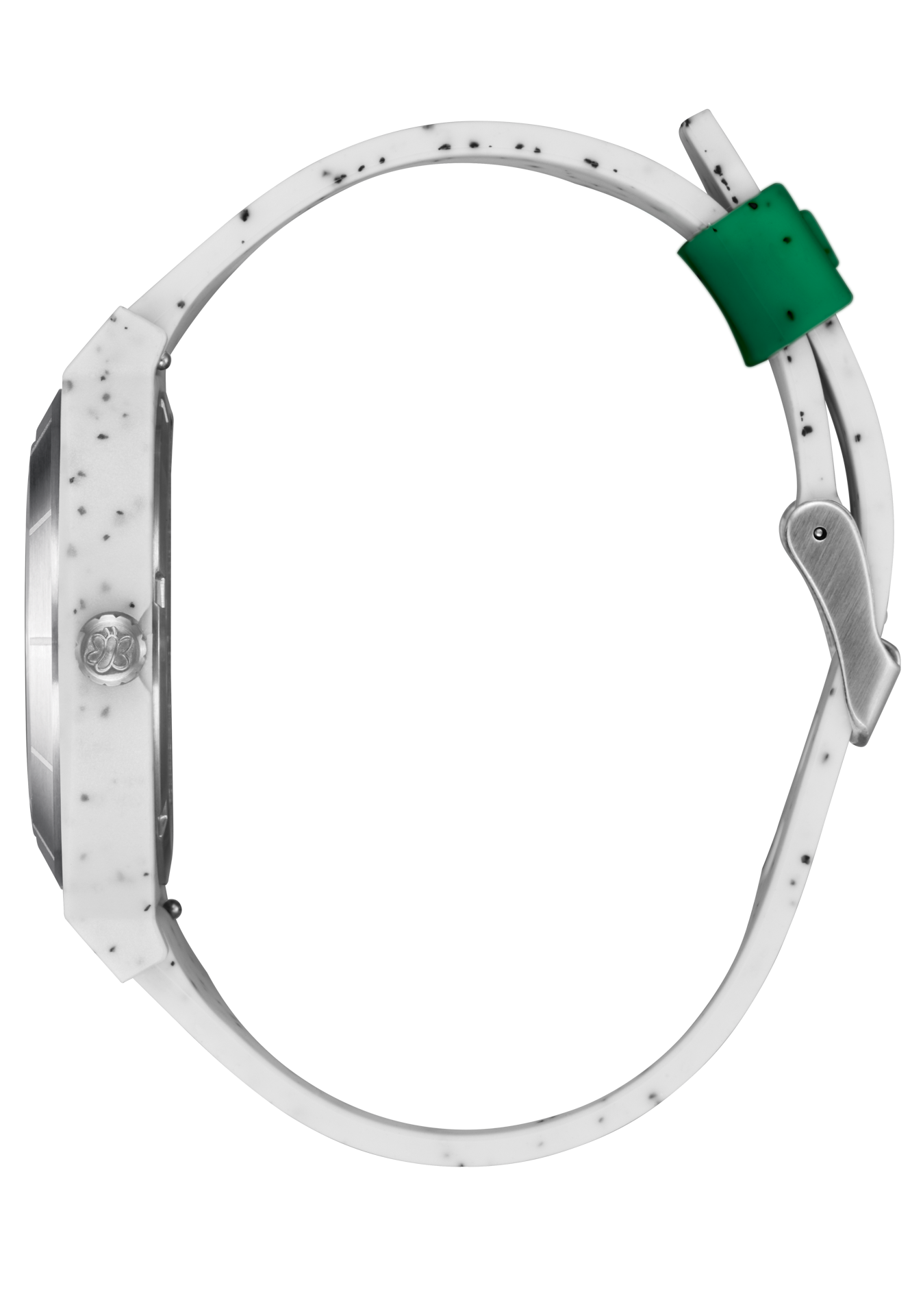 Boîtier de montre en plastique recyclé de 39,5 mm et lunette fixe en acier massif avec une étanchéité de 100 mètres / 10 ATM. Comprend un verre minéral durci, une couronne en acier inoxydable à triple joint, un fond de boîtier vissé en acier inoxydable et des cornes à goupille ressort.