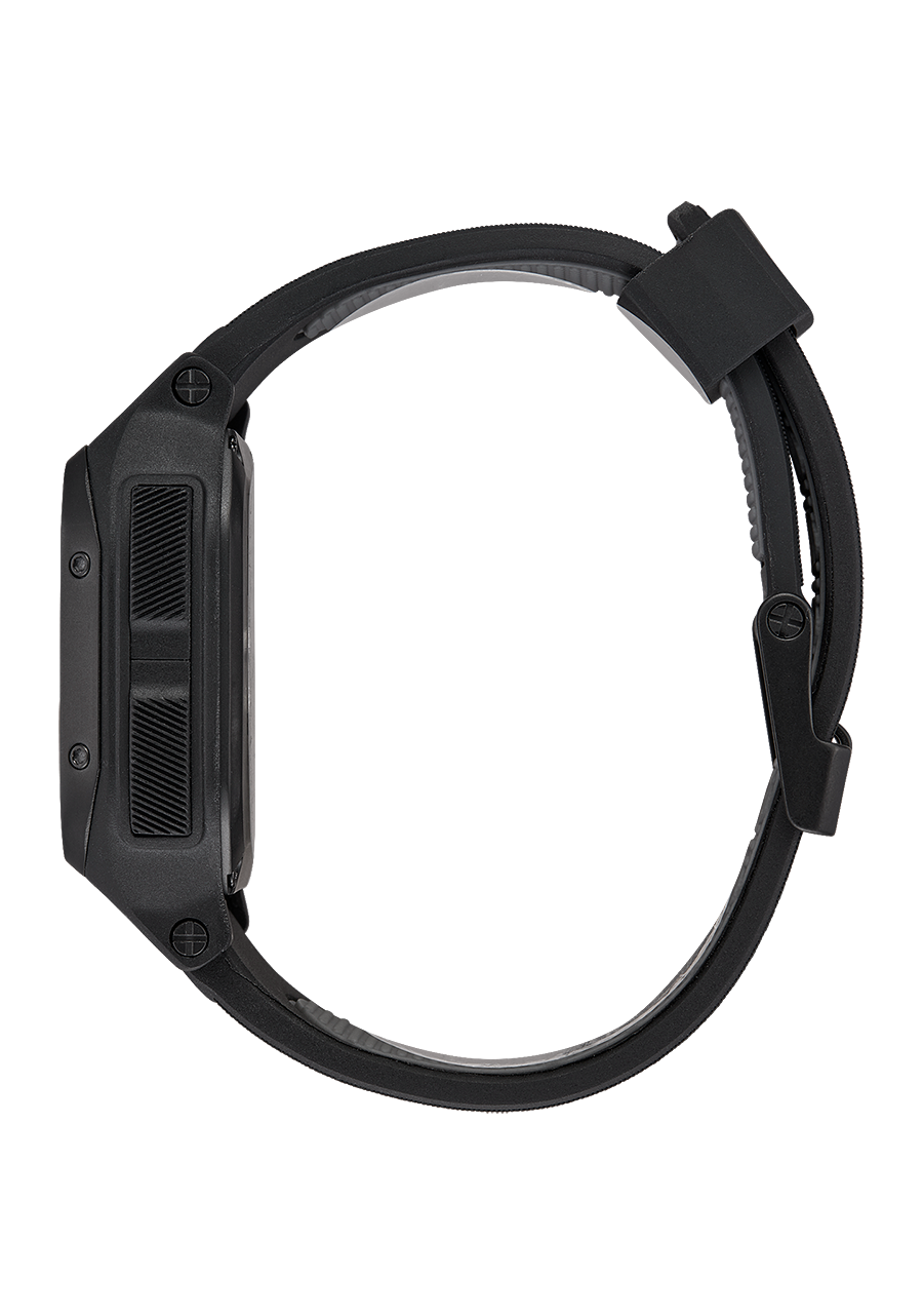 Boîtier TR-90 moulé par injection sur mesure de 47,5 mm et lunette intégrée en acier inoxydable avec une étanchéité de 100 mètres / 10 ATM. Comprend des poussoirs alignés aux coins et un fond de boîtier vissé en acier inoxydable massif.