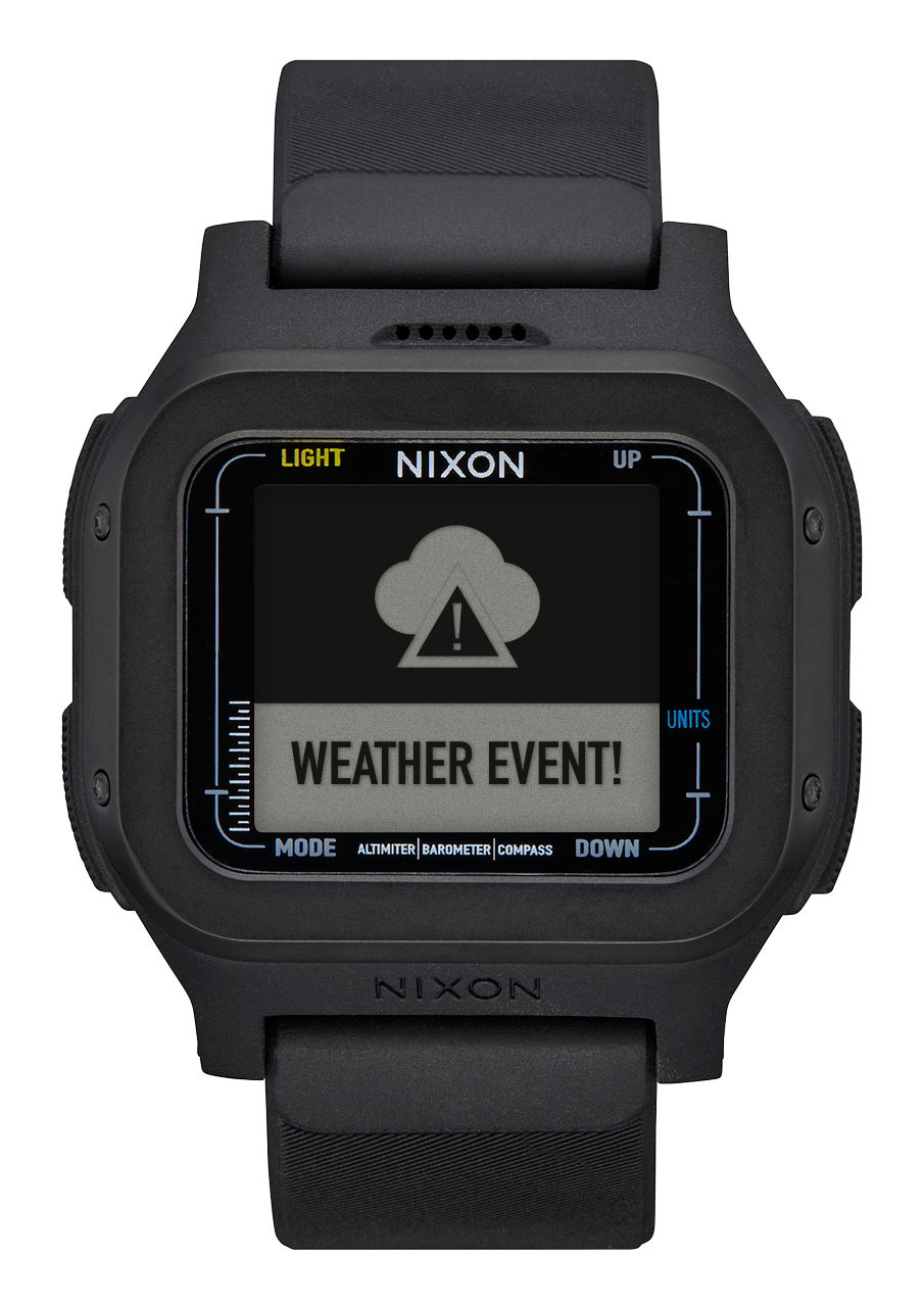 Les fonctions incluent altimètre, baromètre, boussole et thermomètre. Mode camp avec alerte météo, mode session avec suivi des courses, double fuseau horaire en format 12 ou 24 heures, date, chronographe et alarme.