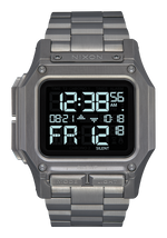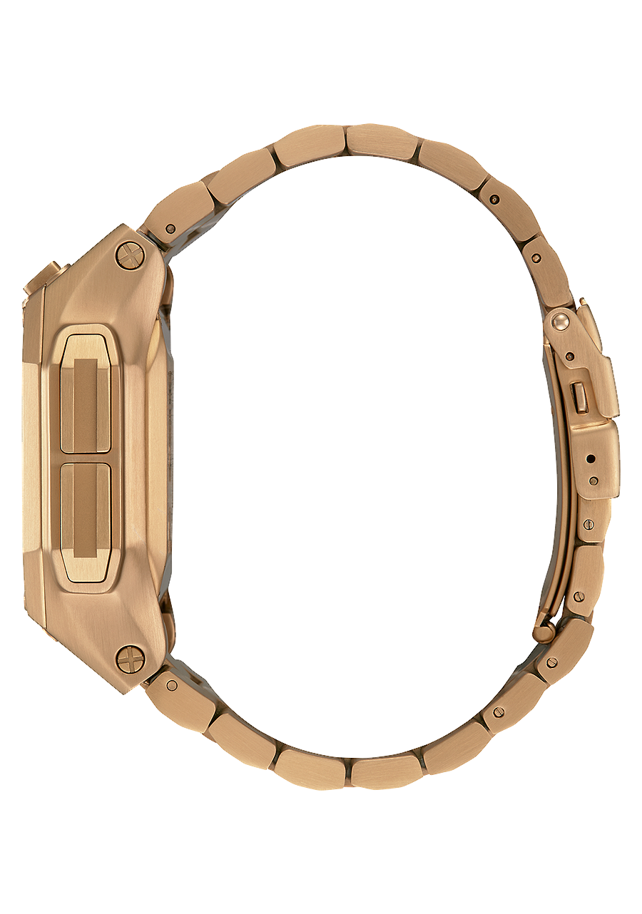 Boîtier en acier inoxydable moulé par injection sur mesure de 46 mm avec une étanchéité de 100 mètres / 10 ATM. Module LCD numérique personnalisé logé dans une coque protectrice en PU et un rembourrage en mousse Poron pour une absorption des chocs et une durabilité exceptionnelles. Équipé de poussoirs en acier inoxydable situés à 6 et 9 heures, verre minéral durci, lunette en acier inoxydable, fond de boîtier vissé en acier inoxydable massif et goupilles vissées.