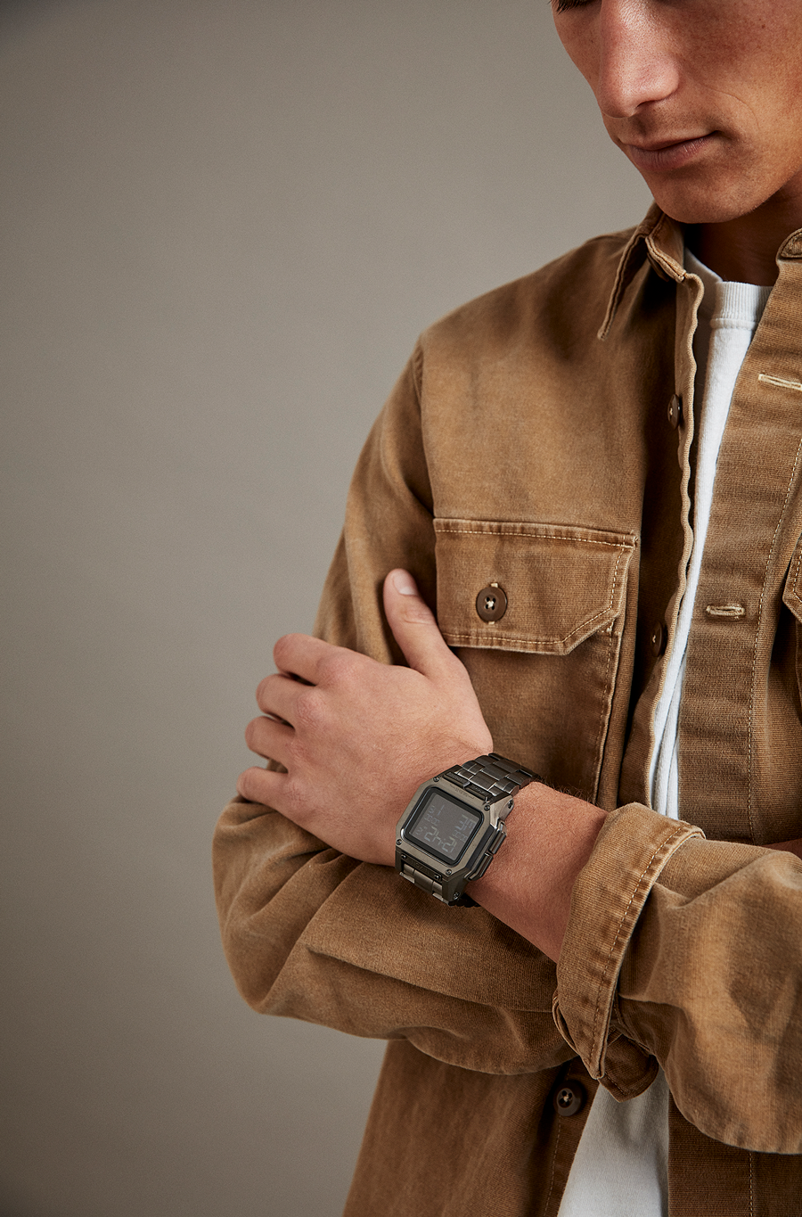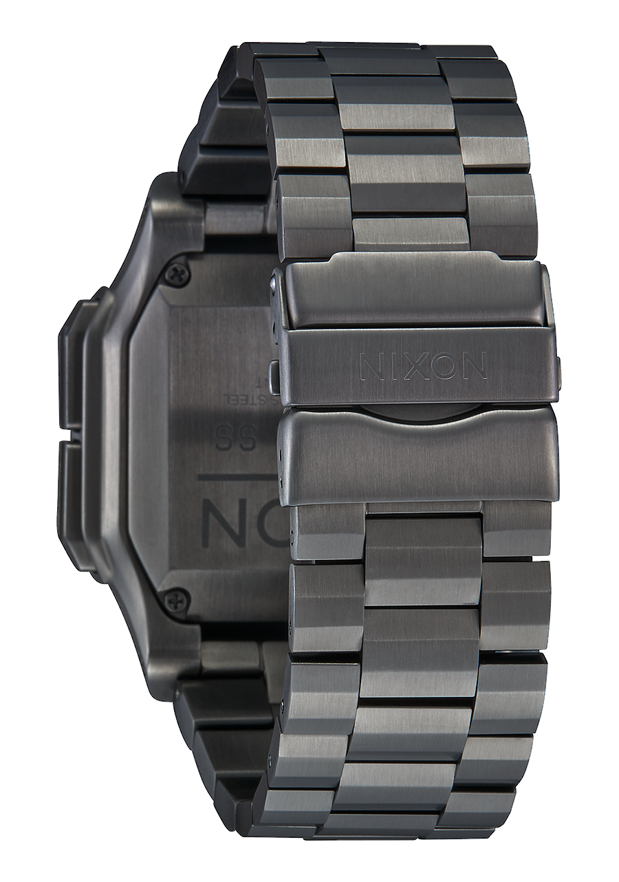 Boîtier en acier inoxydable moulé par injection sur mesure de 46 mm avec une étanchéité de 100 mètres / 10 ATM. Module LCD numérique personnalisé logé dans une coque protectrice en PU et un rembourrage en mousse Poron pour une absorption des chocs et une durabilité exceptionnelles. Équipé de poussoirs en acier inoxydable situés à 6 et 9 heures, verre minéral durci, lunette en acier inoxydable, fond de boîtier vissé en acier inoxydable massif et goupilles vissées.