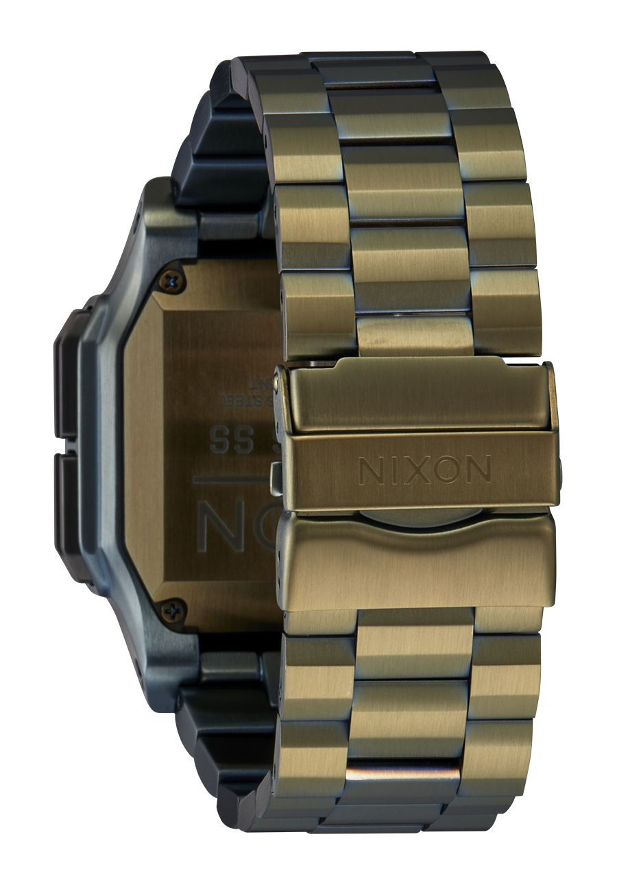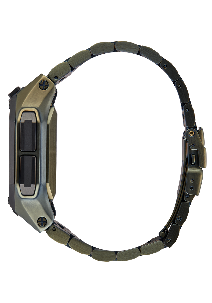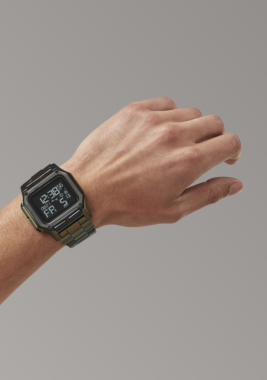 Boîtier en acier inoxydable moulé par injection sur mesure de 46 mm avec une étanchéité de 100 mètres / 10 ATM. Module LCD numérique personnalisé logé dans une coque protectrice en PU et un rembourrage en mousse Poron pour une absorption des chocs et une durabilité exceptionnelles. Équipé de poussoirs en acier inoxydable situés à 6 et 9 heures, verre minéral durci, lunette en acier inoxydable, fond de boîtier vissé en acier inoxydable massif et goupilles vissées.