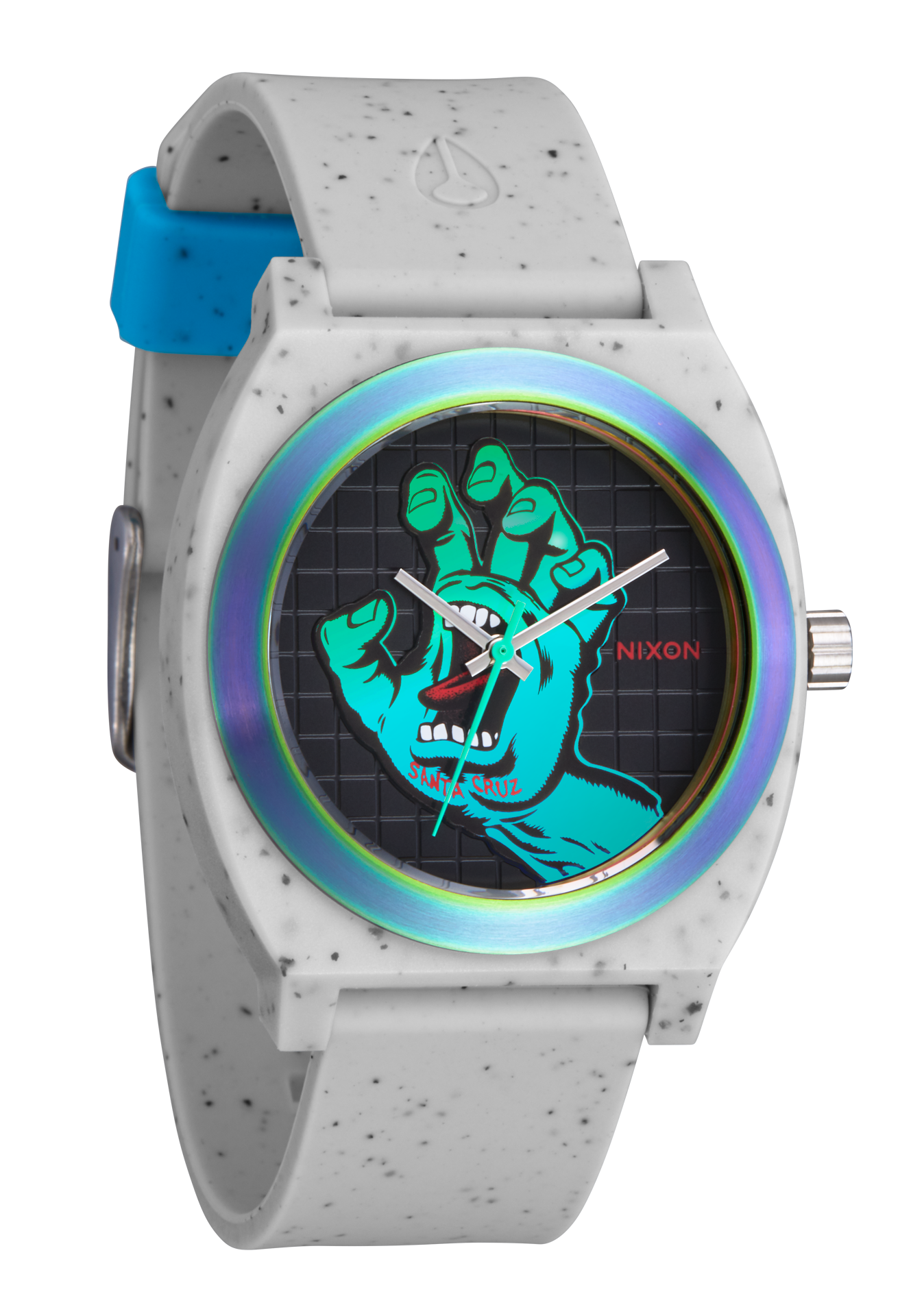 Le cadran présente des aiguilles moulées sur mesure avec une aiguille des secondes Screaming Hand, des index bâtons et un logo Santa Cruz en relief 3D.