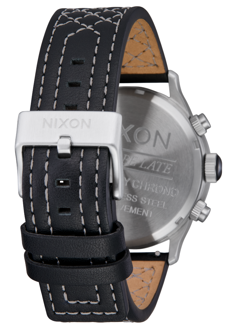 Boîtier personnalisé en acier inoxydable massif de 42 mm et lunette fixe avec une étanchéité de 100 mètres / 10 ATM. Équipé d'un verre minéral durci, d'une couronne en acier inoxydable à triple joint avec remplissage en émail, de poussoirs en acier inoxydable à double joint, d'un fond de boîtier vissé en acier inoxydable et de cornes à goupille ressort.