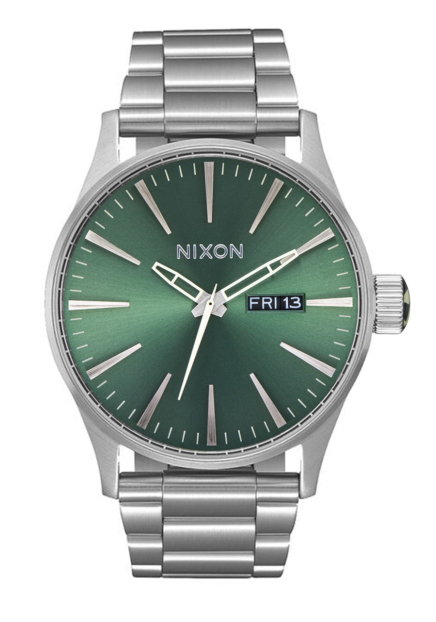La montre Nixon Sentry en acier inoxydable utilise un mouvement à quartz japonais Miyota 2305 à 3 aiguilles et dispose d'une fonction bilingue jour et date en anglais et en espagnol.