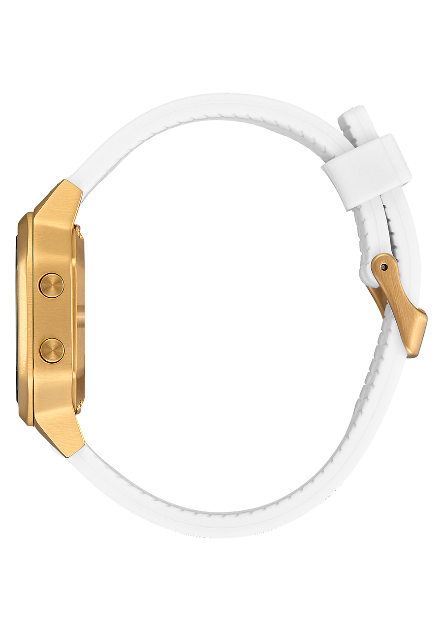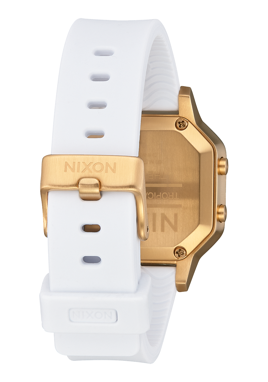 Bracelet de montre en silicone ultra-doux moulé par injection sur mesure, conique de 18 à 16 mm, avec un passant verrouillable breveté. Comprend également une boucle en acier inoxydable massif et une connexion par barre à vis.