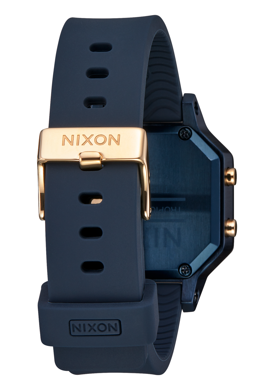 Bracelet de montre en silicone ultra-doux moulé par injection sur mesure, conique de 18 à 16 mm, avec un passant verrouillable breveté. Comprend également une boucle en acier inoxydable massif et une connexion par barre à vis.