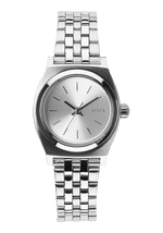 Le boîtier de la Small Time Teller est en acier inoxydable, avec une lunette fixe en acier inoxydable massif. Le bracelet est également en acier inoxydable, avec un design à 5 maillons de style bijou et une boucle à double verrouillage. Cette montre est durable et adaptée à un usage quotidien, grâce à son cristal minéral trempé et sa résistance à l'eau de 100 mètres, lui permettant de résister à des activités comme la natation.