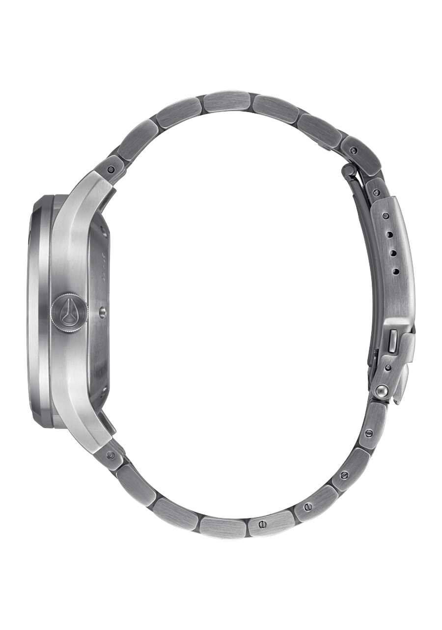 Le boîtier de la Nixon Spectra est en acier inoxydable massif et a un diamètre de 40 mm. Le bracelet est un bracelet en acier inoxydable massif personnalisé à 5 maillons, effilé de 20 mm à 18 mm, avec une boucle à double verrouillage en acier inoxydable et une connexion à barres à ressort. Il présente un type de bracelet à balancier libre et a une largeur entre les cornes de 20 mm.