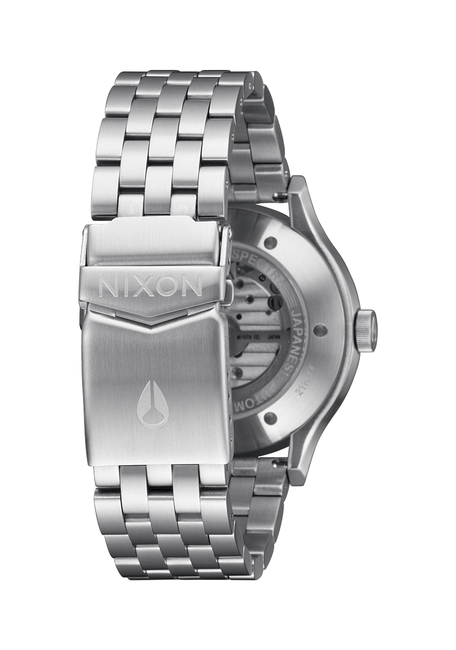 Le cadran d'exposition révèle le mouvement automatique de la montre. Le cadran présente des index bâtons appliqués et en relief. Le logo Nixon est appliqué sous le verre de la montre pour un effet de profondeur supplémentaire.