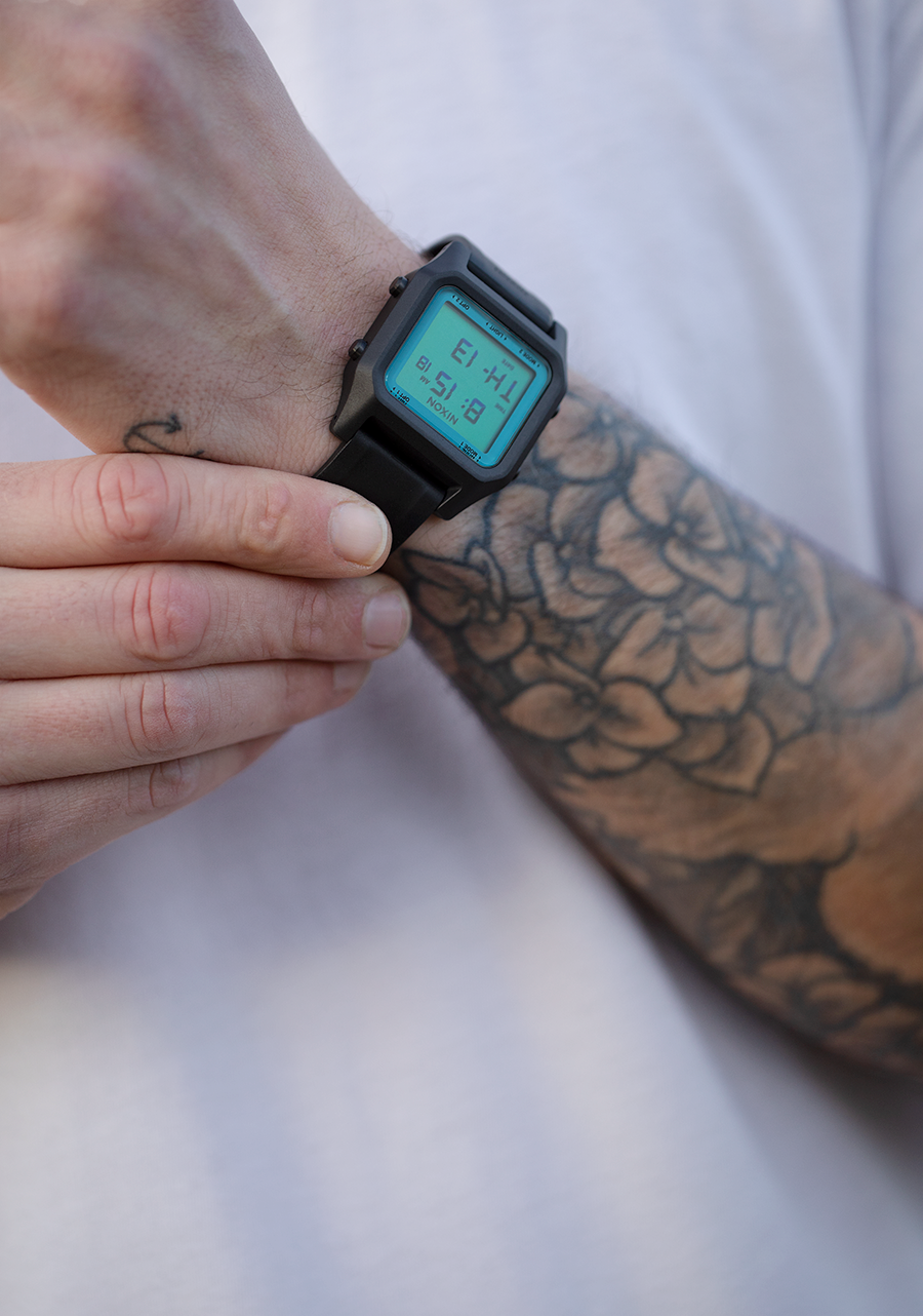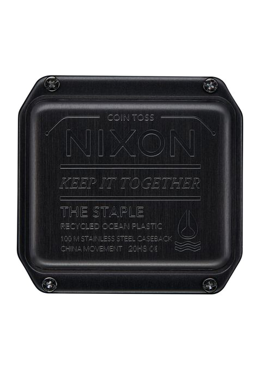 Boîtier de 39 mm en plastique recyclé des océans renforcé de fibres, moulé par injection personnalisée, avec une étanchéité de 100 mètres / 10 ATM. Équipé de poussoirs en acier inoxydable, d'un verre minéral durci, d'un fond de boîtier vissé en acier inoxydable massif et de cornes à goupilles vissées.