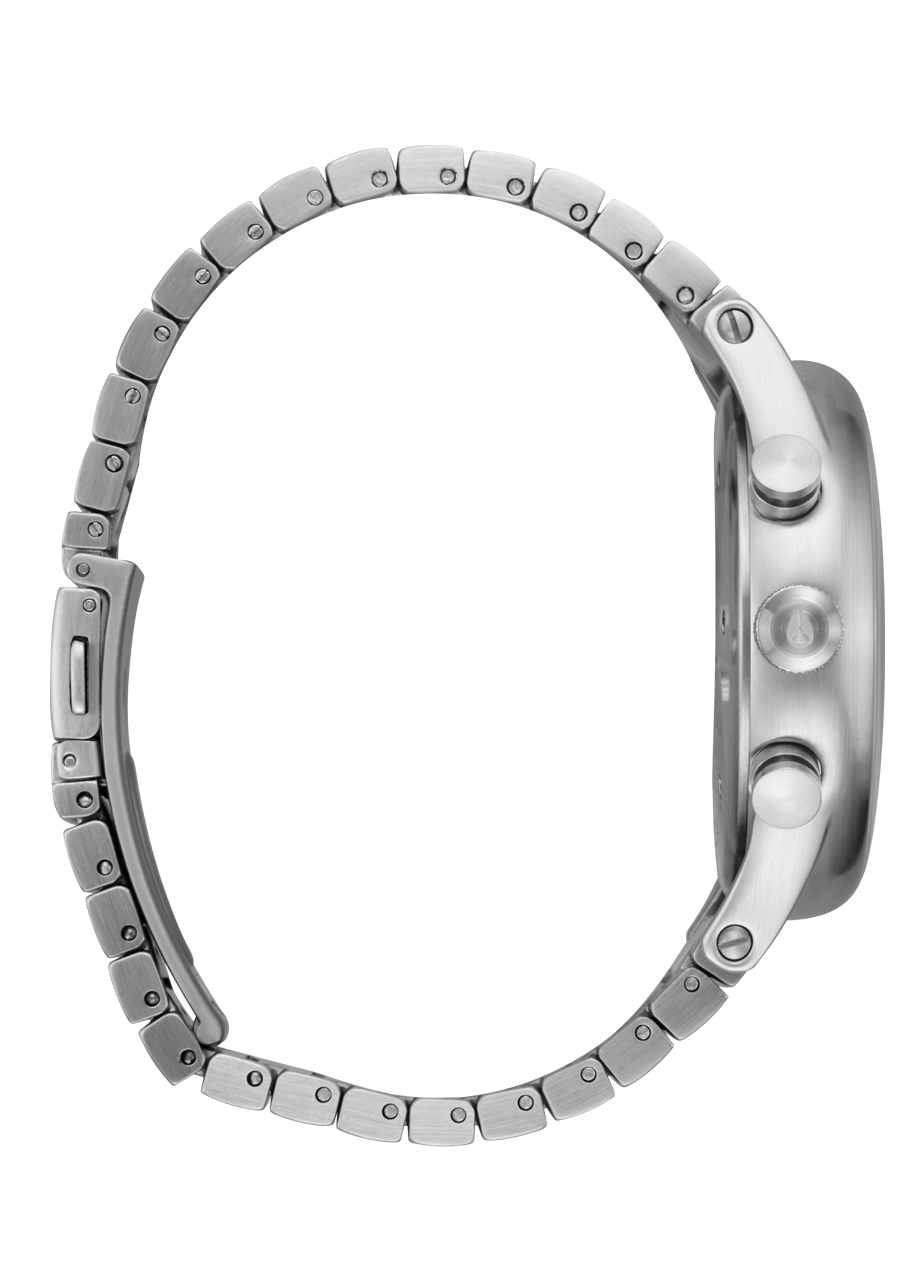 Le chronographe à deux compteurs se trouve sous des aiguilles des minutes et des secondes incurvées et un verre bombé.