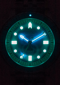 Le cadran est entouré d'une bague de cadran personnalisée avec une piste des secondes imprimée, des index appliqués en relief et des aiguilles moulées sur mesure. La luminescence est appliquée sur les index et les aiguilles de la montre.