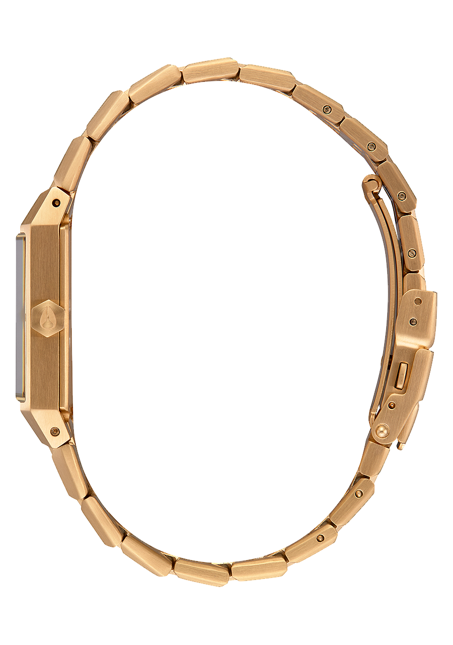 Boîtier rectangulaire en acier inoxydable sur mesure de 34 mm, 50 MÈTRES / 5 ATM, avec un verre minéral durci ultra-fin qui dépasse fièrement du boîtier, couronne moulée sur mesure, fond de boîtier vissé en acier inoxydable.