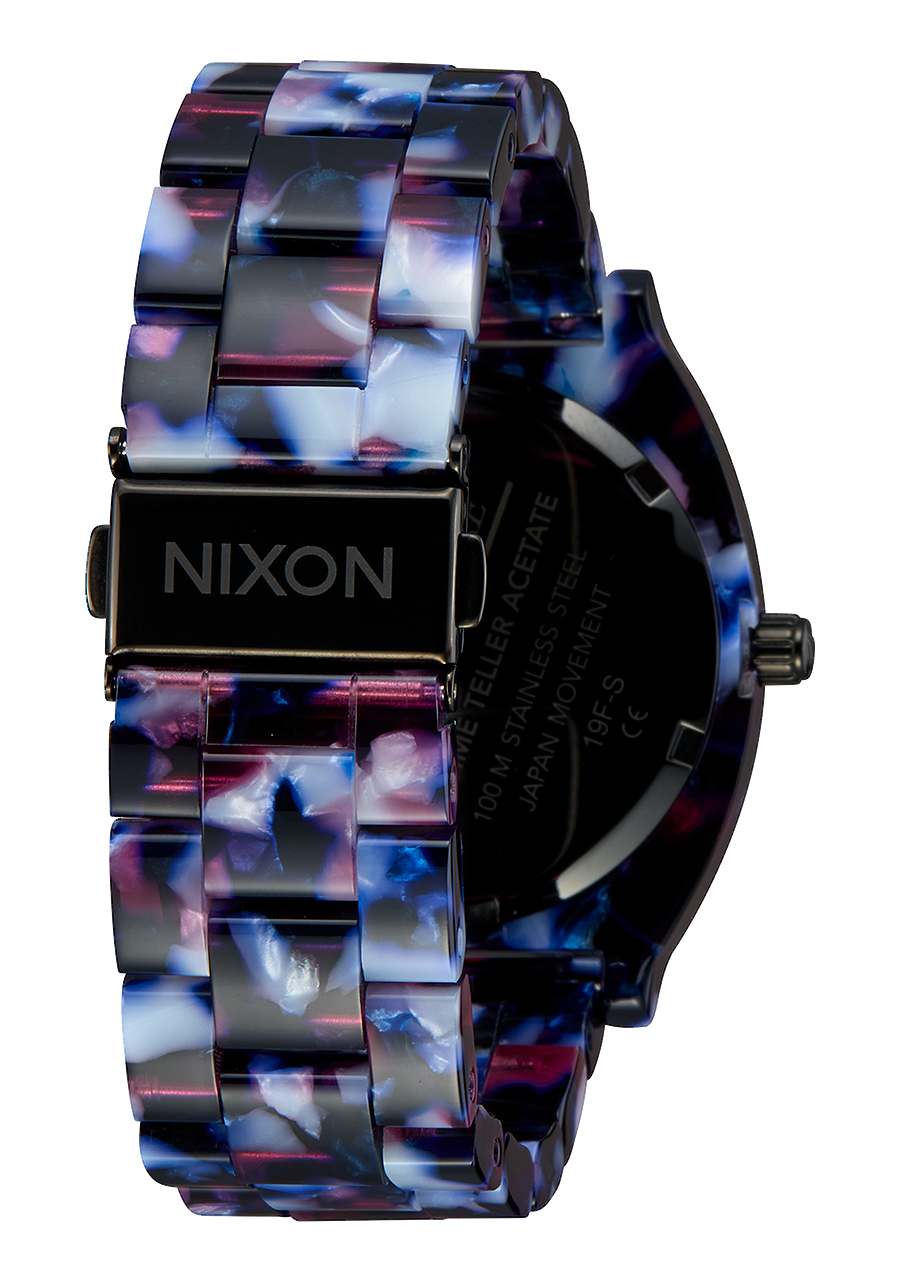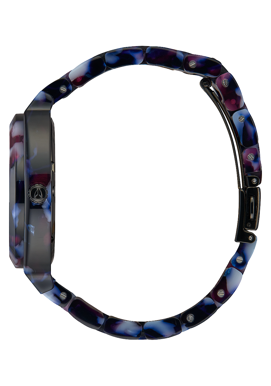 La Time Teller Acetate dispose d'un boîtier en acétate fait main sur mesure et d'un bracelet en acétate fait main de 20 mm avec 3 maillons. L'acétate est un matériau durable, léger et plus susceptible de se plier et de rebondir que de se casser par rapport à d'autres plastiques en raison de sa nature moins rigide.
