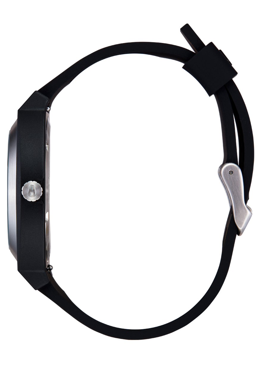 Boîtier en plastique recyclé de 39,5 mm et lunette fixe en acier massif avec une étanchéité de 100 mètres / 10 ATM. Équipé d'un verre minéral durci, d'une couronne en acier inoxydable à triple joint, d'un fond de boîtier vissé en acier inoxydable et de cornes à goupille ressort.