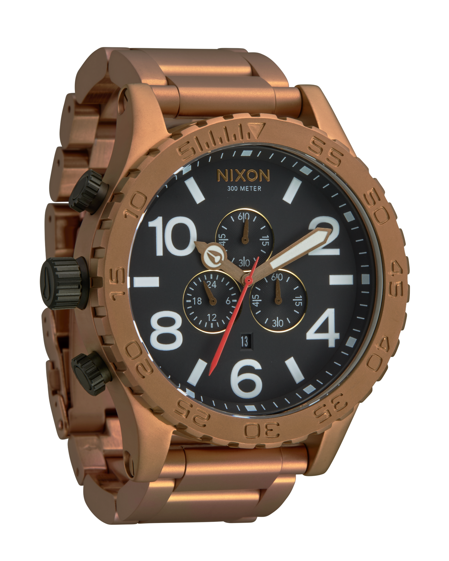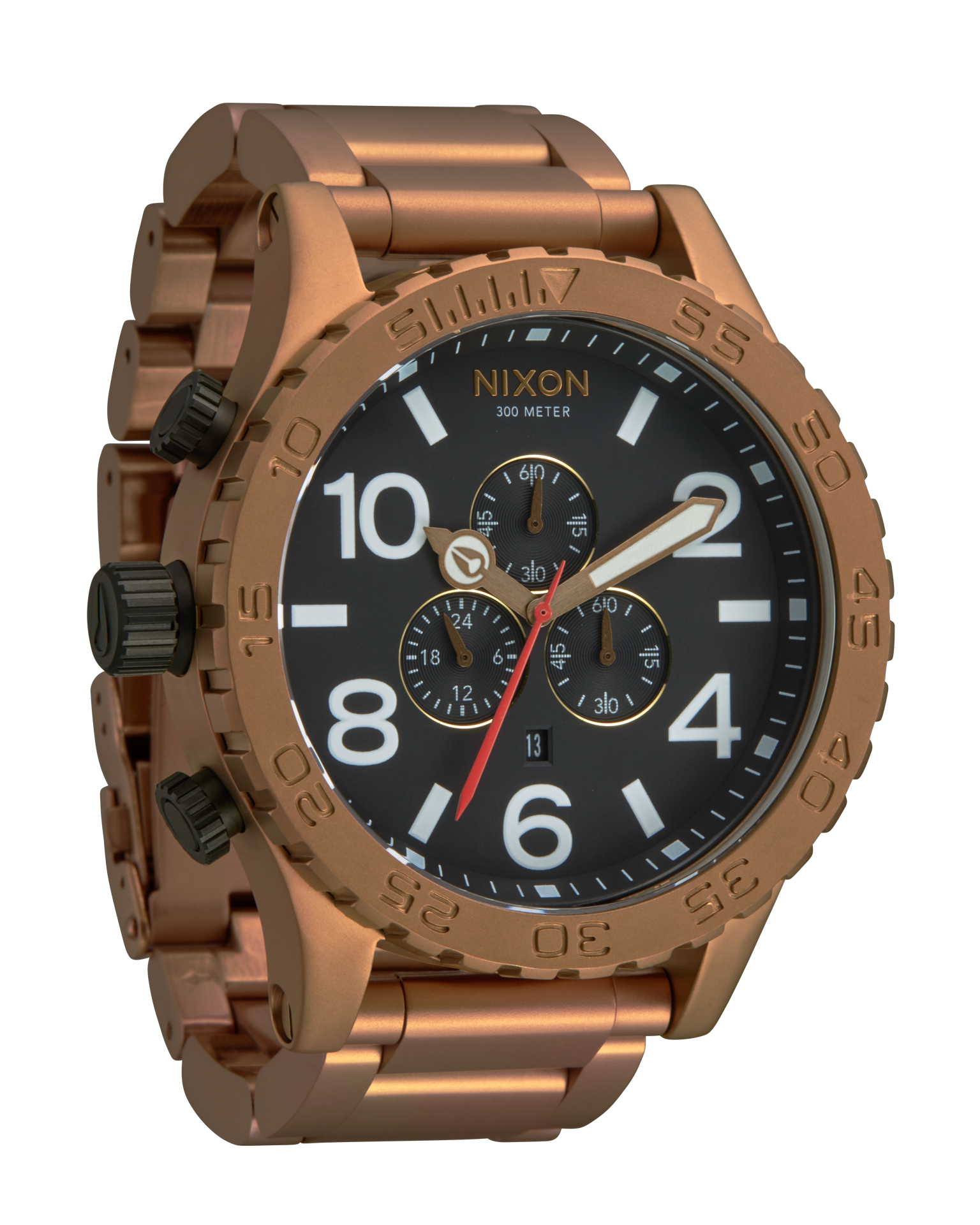 51 mm, 300 metri/30 ATM acciaio inossidabile massiccio personalizzato, lunetta girevole unidirezionale in acciaio inossidabile massiccio o acetato fatto a mano con timer di conto alla rovescia, vetro minerale indurito, corona e pulsanti a vite, fondello a vite in acciaio inossidabile e anse con perni a vite.