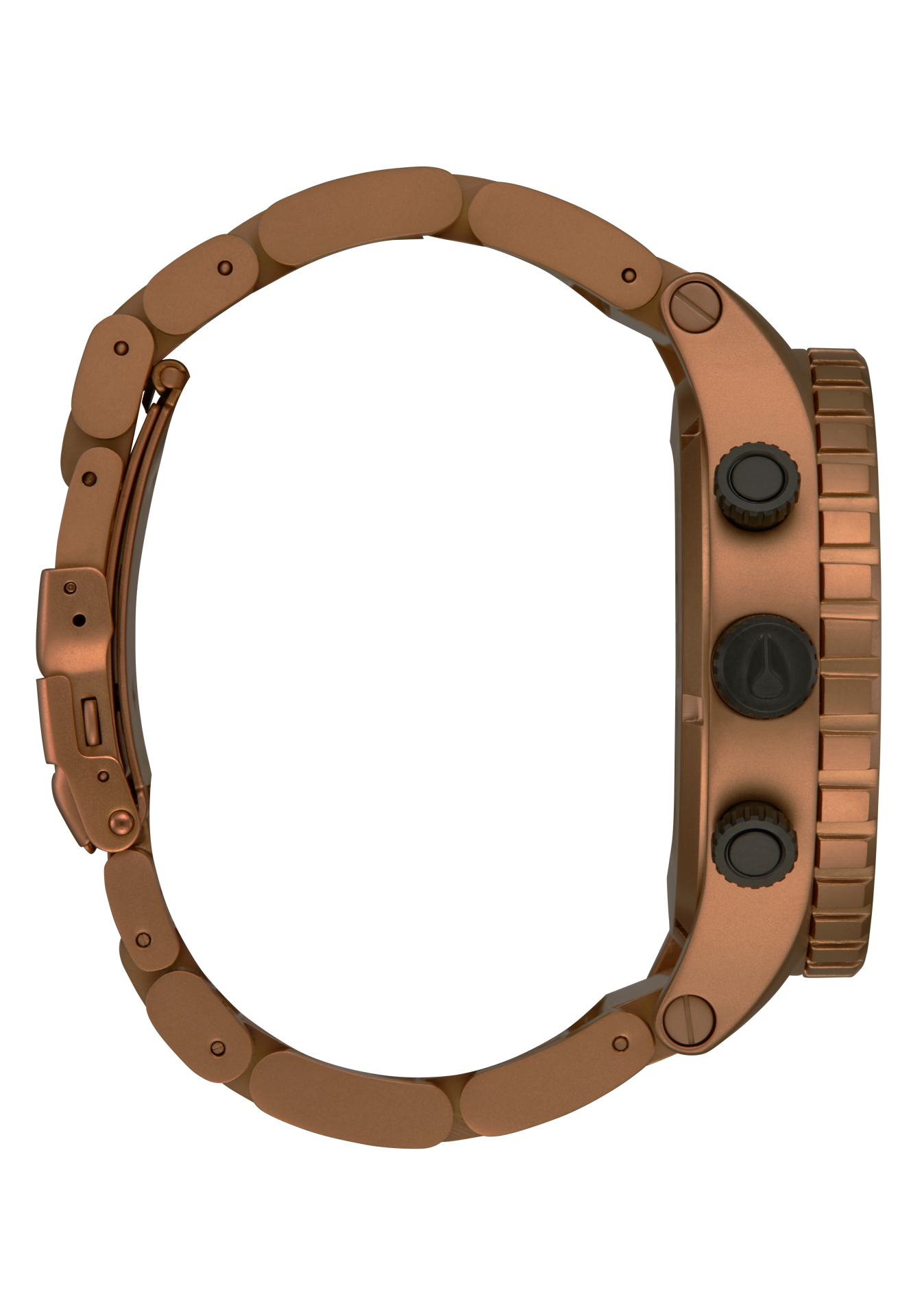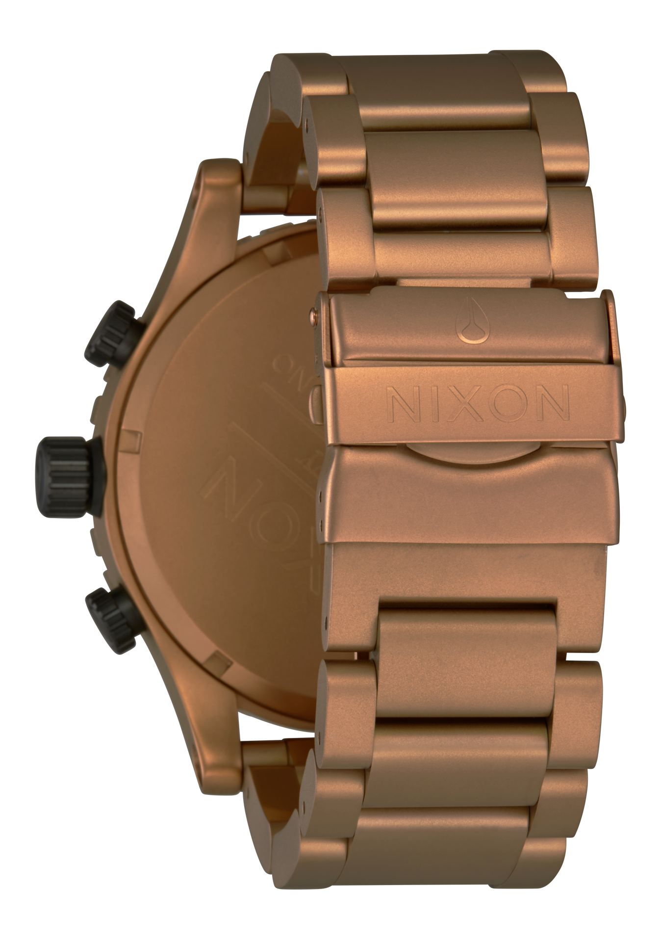 The crown and pushers are located on the 9 o'clock side of the case instead of 3 o'clock to prevent "wrist bite" during active use. Six-hand chronograph with 24-hour and second timer subdials.