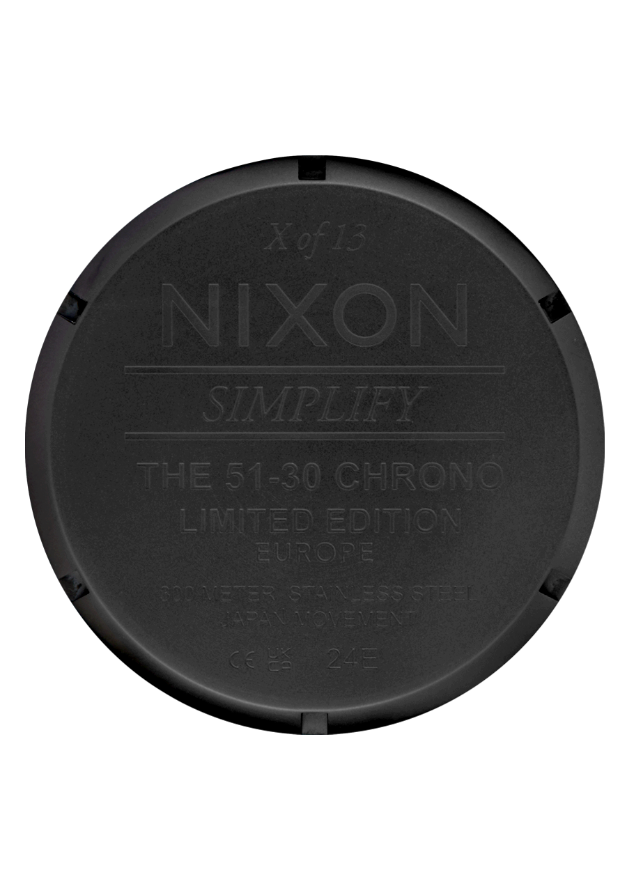 Cinque 13 segnano ogni ora intorno al quadrante, con un solo 13 luminescente. Quale? Beh, dipende da quale parte del mondo lo prendi. I pulsanti e la corona a vite si trovano sul lato delle 9 anziché delle 3 per prevenire "morsi al polso" durante l'uso attivo. Ghiera girevole unidirezionale per un timer analogico alla rovescia. Cronografo a sei lancette con timer di 24 ore e sottoquadranti del timer dei secondi, tutto in nero su nero.