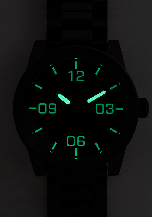 Il quadrante include indici arabi audaci stampati in stile militare e indici a bastone, una scala dei secondi stampata e lancette sagomate su misura.