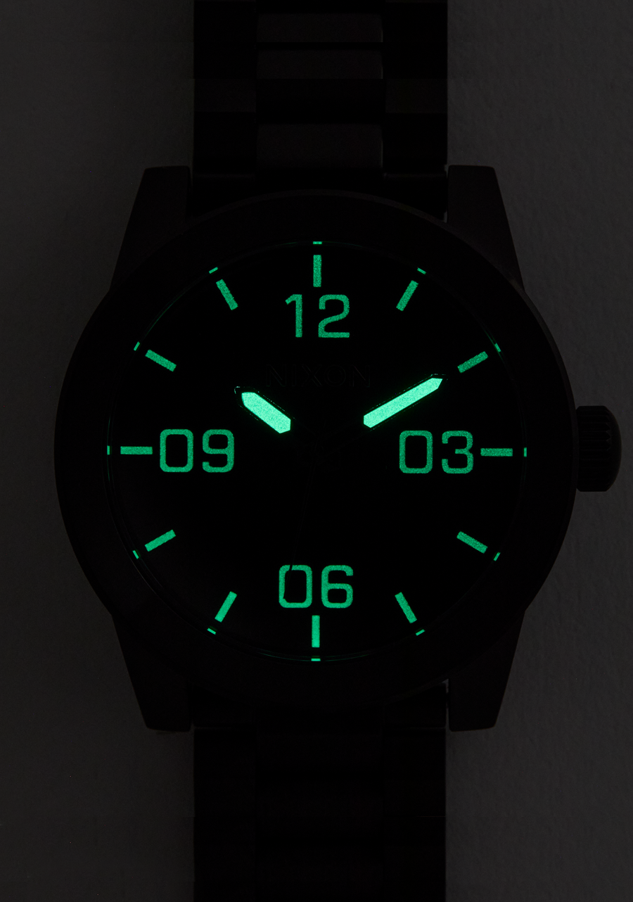Die Nixon Corporal Uhr verwendet ein Miyota Japanisches Quarz-Uhrwerk mit drei Zeigern.