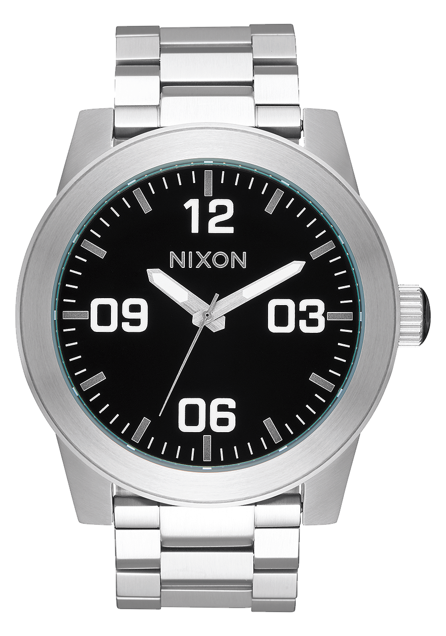 Il quadrante include indici arabi audaci stampati in stile militare e indici a bastone, una scala dei secondi stampata e lancette sagomate su misura.