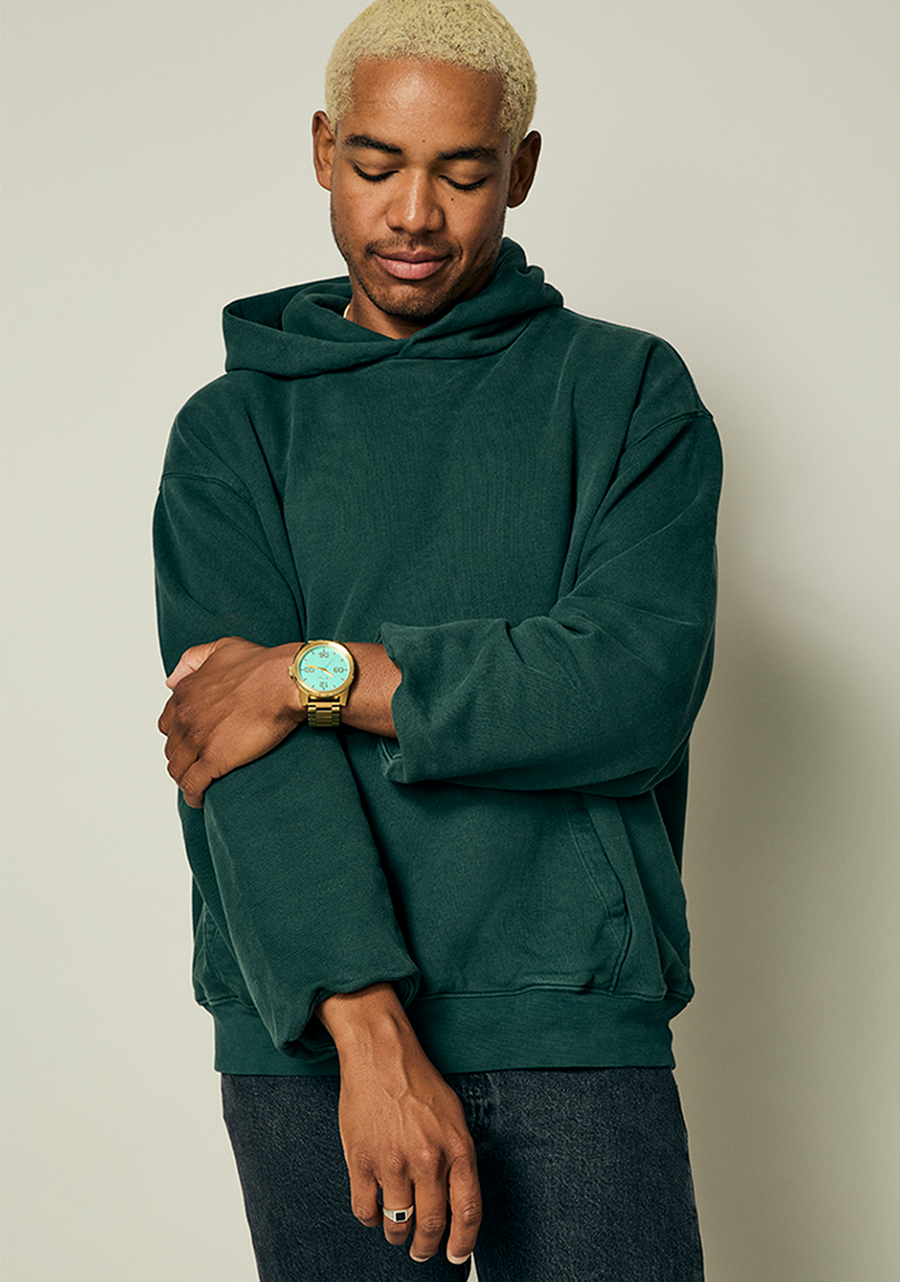 Il quadrante include indici arabi audaci stampati in stile militare e indici a bastone, una scala dei secondi stampata e lancette sagomate su misura.