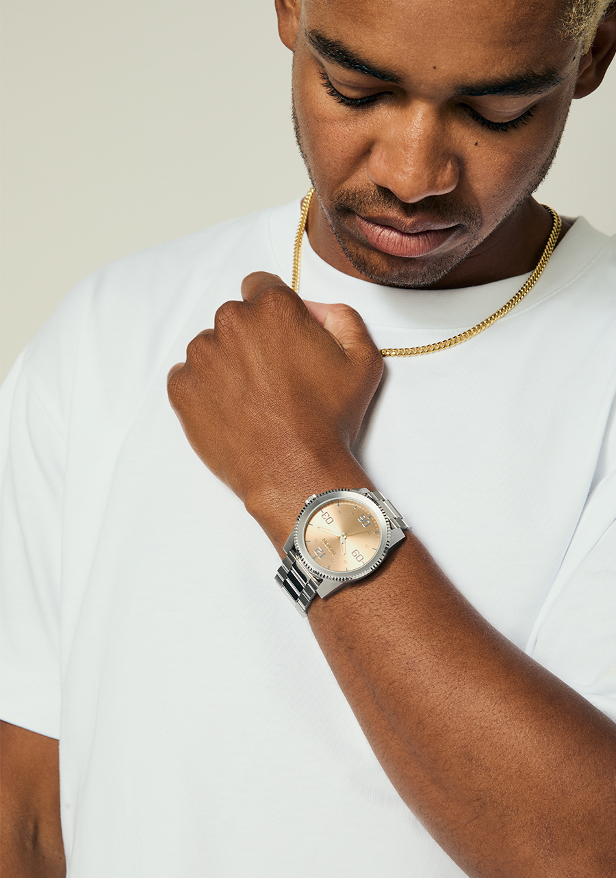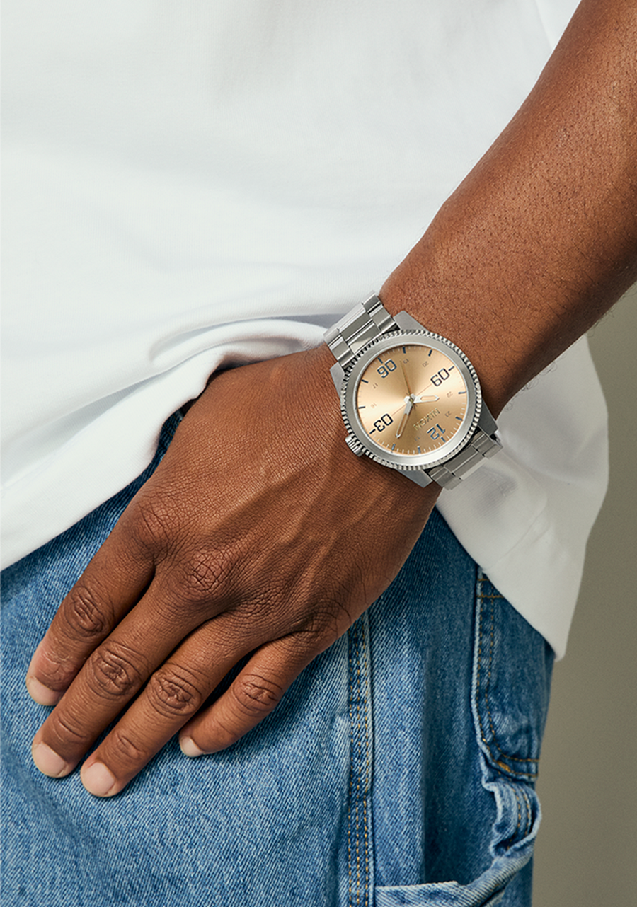 Il quadrante include indici arabi audaci stampati in stile militare e indici a bastone, una scala dei secondi stampata e lancette sagomate su misura.