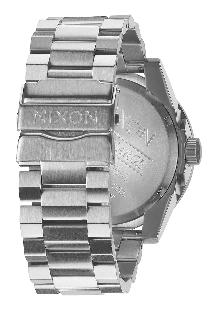 Der Nixon Corporal verfügt über ein 48 mm großes, maßgeschneidertes Gehäuse aus Edelstahl, eine feste Lünette aus Edelstahl und ein gehärtetes Mineralglas.