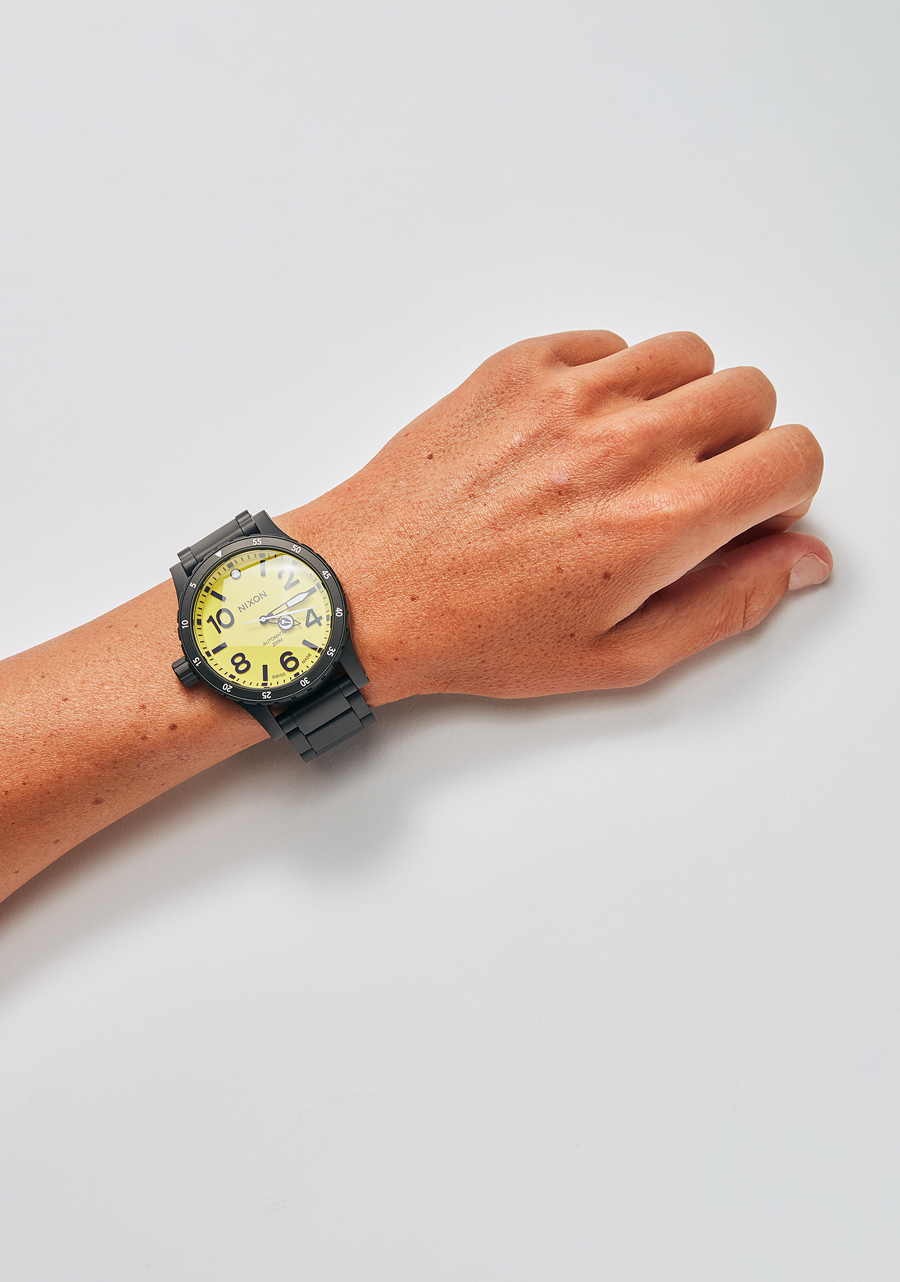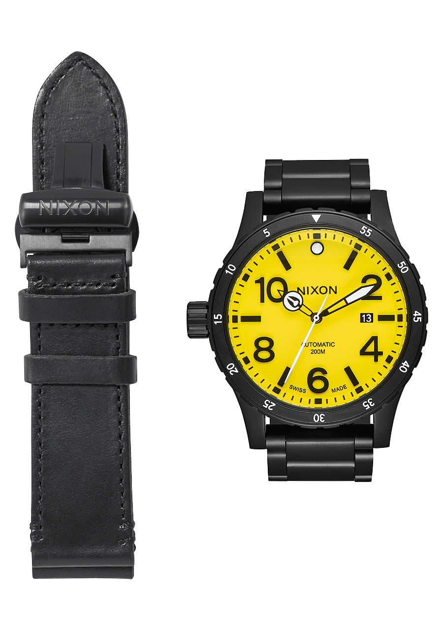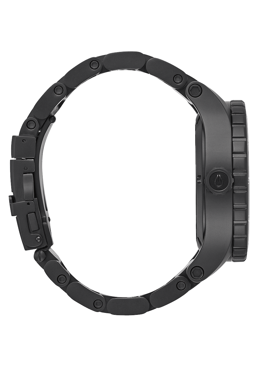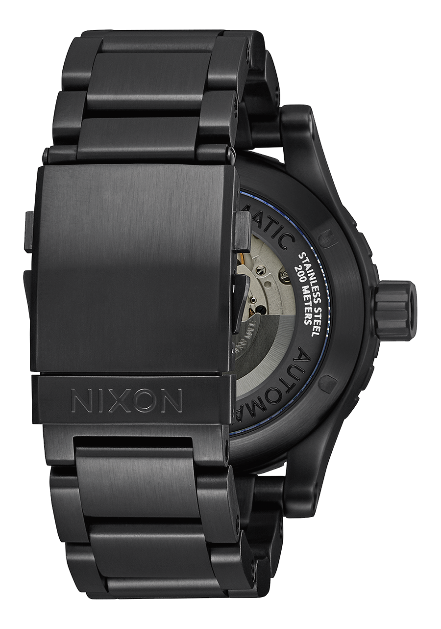 Cassa personalizzata in acciaio inossidabile massiccio da 46 mm, 200 metri/20 ATM con lunetta girevole unidirezionale in acciaio inossidabile. Inserto lunetta in acciaio inossidabile placcato IP con marcature del timer di conto alla rovescia riempite di colore. Vetro zaffiro bombato con rivestimento antiriflesso sul lato inferiore. Corona a vite in acciaio inossidabile con tripla guarnizione al lato delle 3. Fondello a vite in acciaio inossidabile con vetro espositivo che mostra il rotore del movimento inciso su misura. Barre a vite esagonali da 2 mm in acciaio inossidabile. Numero seriale inciso singolarmente sul fondello.