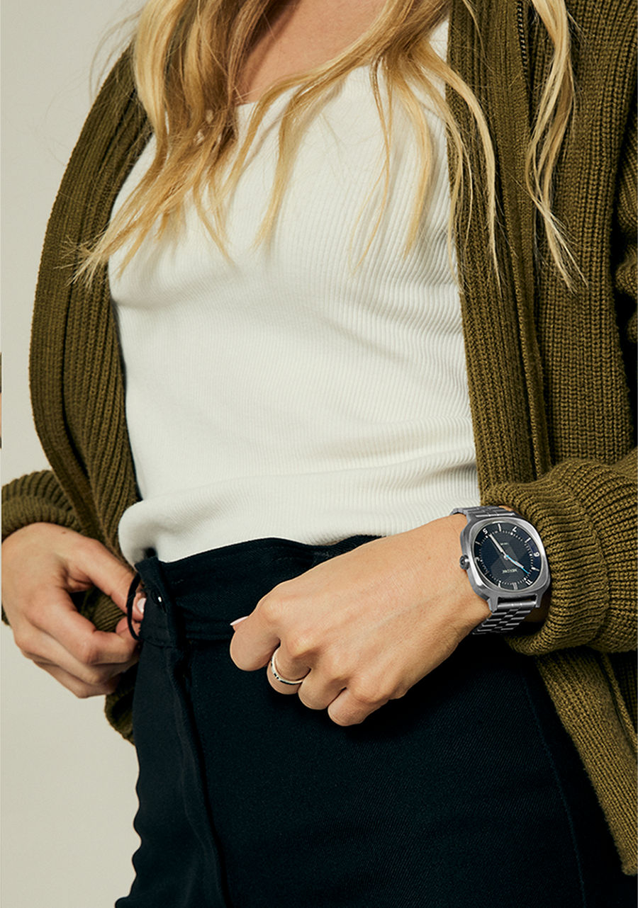 Il Fremont 40 utilizza un design della cassa “squircle”, che fonde un quadrato e un cerchio per un look distintivo.