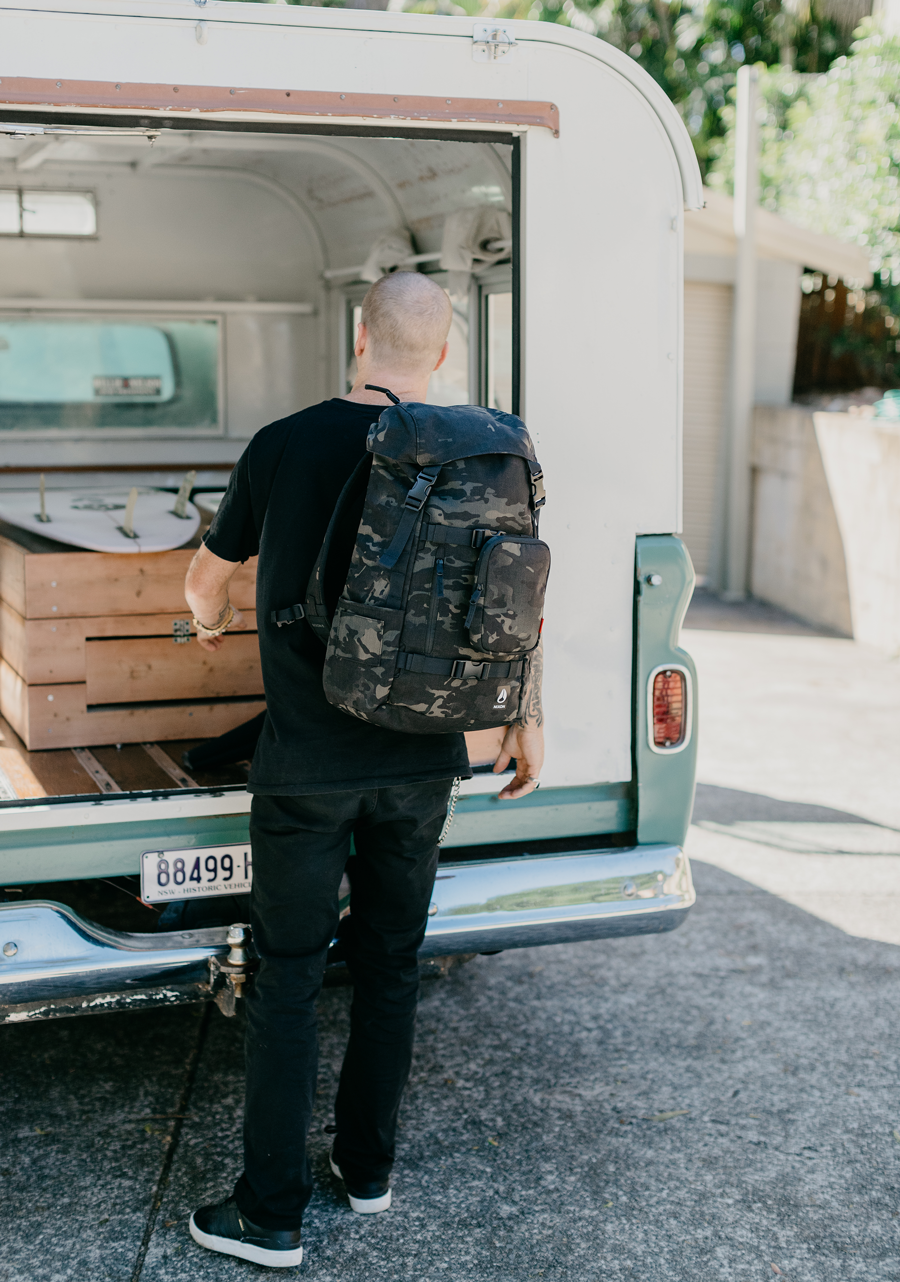 Eine etwas größere (30 Liter) Version unseres All-Terrain-Rucksacks mit seitlichem Laptopfach und großem Hauptfach mit Zubehörfächern und weich gefütterter Uhrentasche. Mit einem von oben zu öffnenden Tabletfach auf der Rückseite und einer vertikalen Fronttasche. Verstaubare Skate-Gurte und seitliche Trinkblasenfächer. Ausgestattet mit unserem modularen Pod-System.