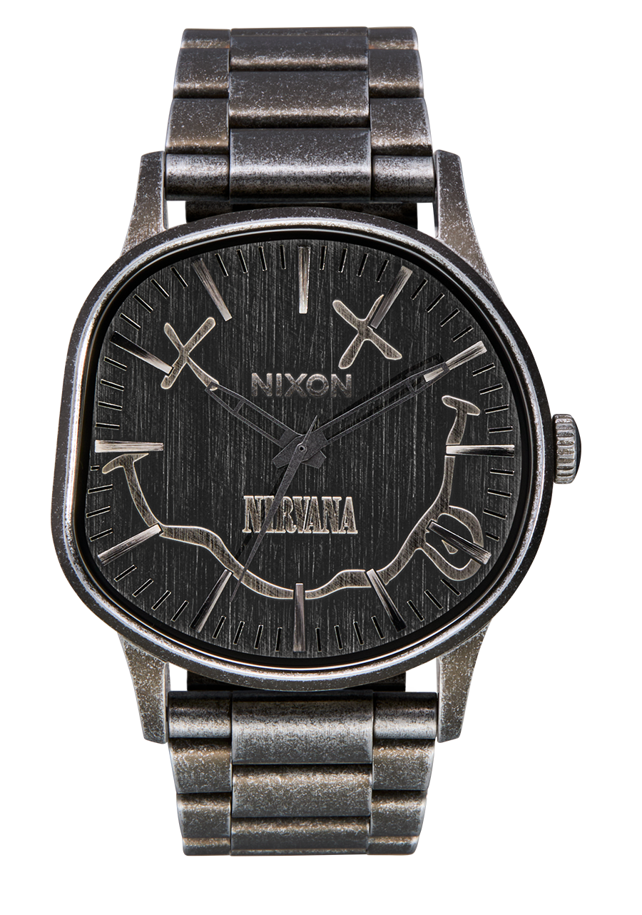 Un gruppo di questo calibro merita un orologio come nessun altro. La collezione Nirvana include il Sentry Wobble, con una cassa deformata che si adatta perfettamente al suo iconico logo Smiley. A accompagnare il Wobble c'è il Sentry Leather, il cui cinturino ha la sensazione di un morbidissimo pullover, e un quadrante a raggi, su cui le lettere 'Nirvana' sono incluse obliquamente come indici. Infine, c'è il minimalista Time Teller, che fa una dichiarazione chiara: un volto Smiley nero su quadrante nero, con il logo e la scritta Nirvana gialla.