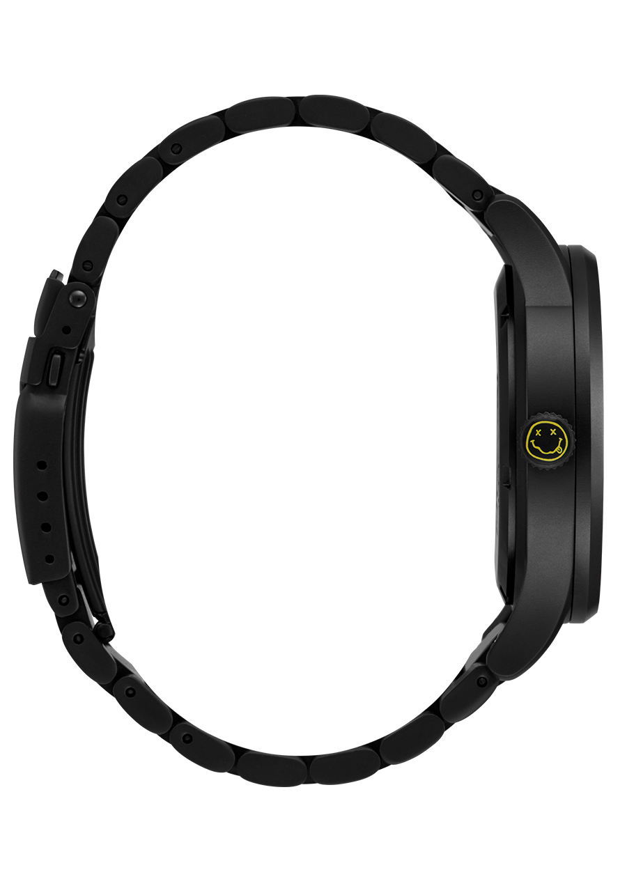 Un design unico della cassa "oscillante" che si adatta alla curvatura del famoso volto sorridente disegnato a mano di Nirvana sul quadrante.