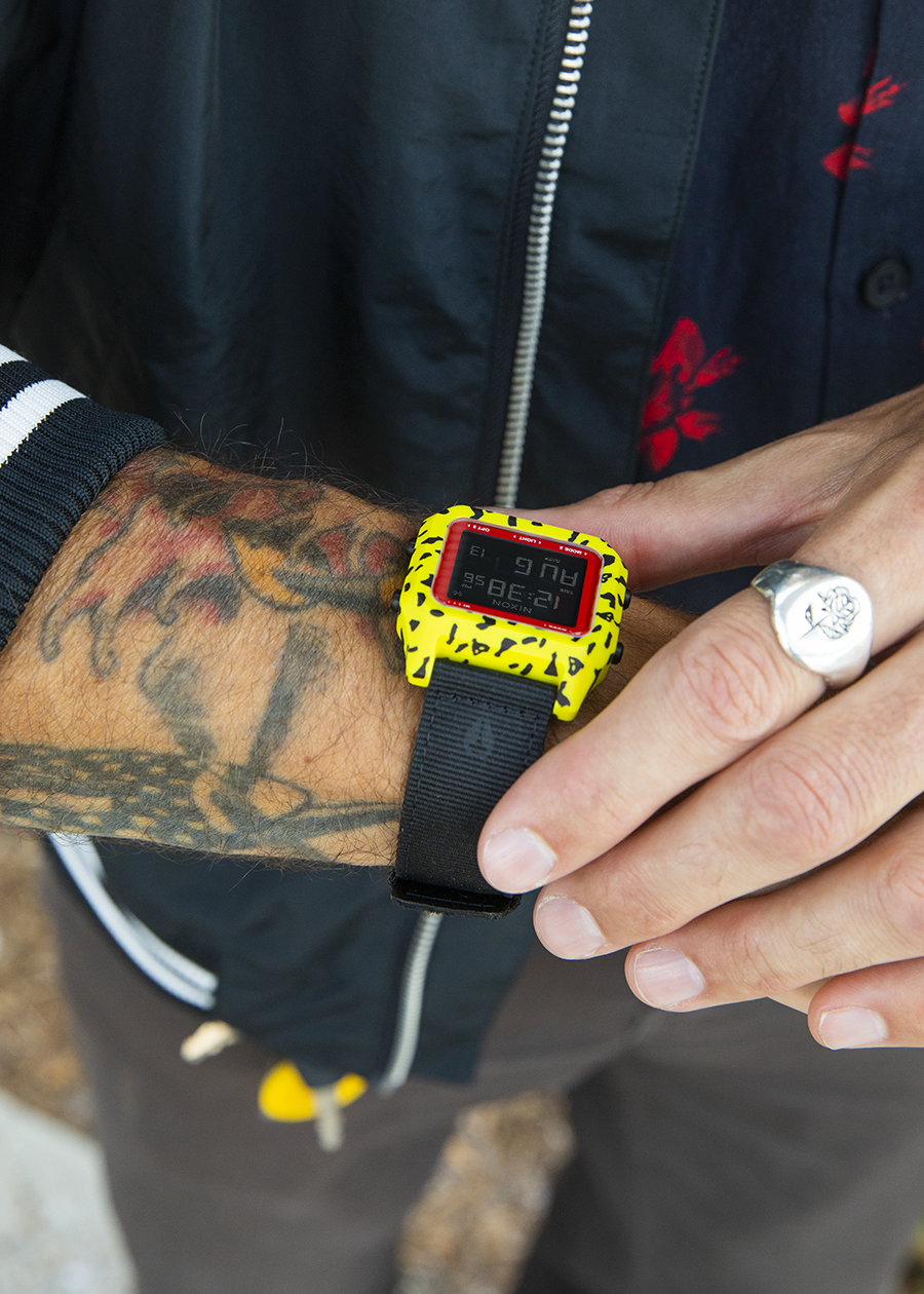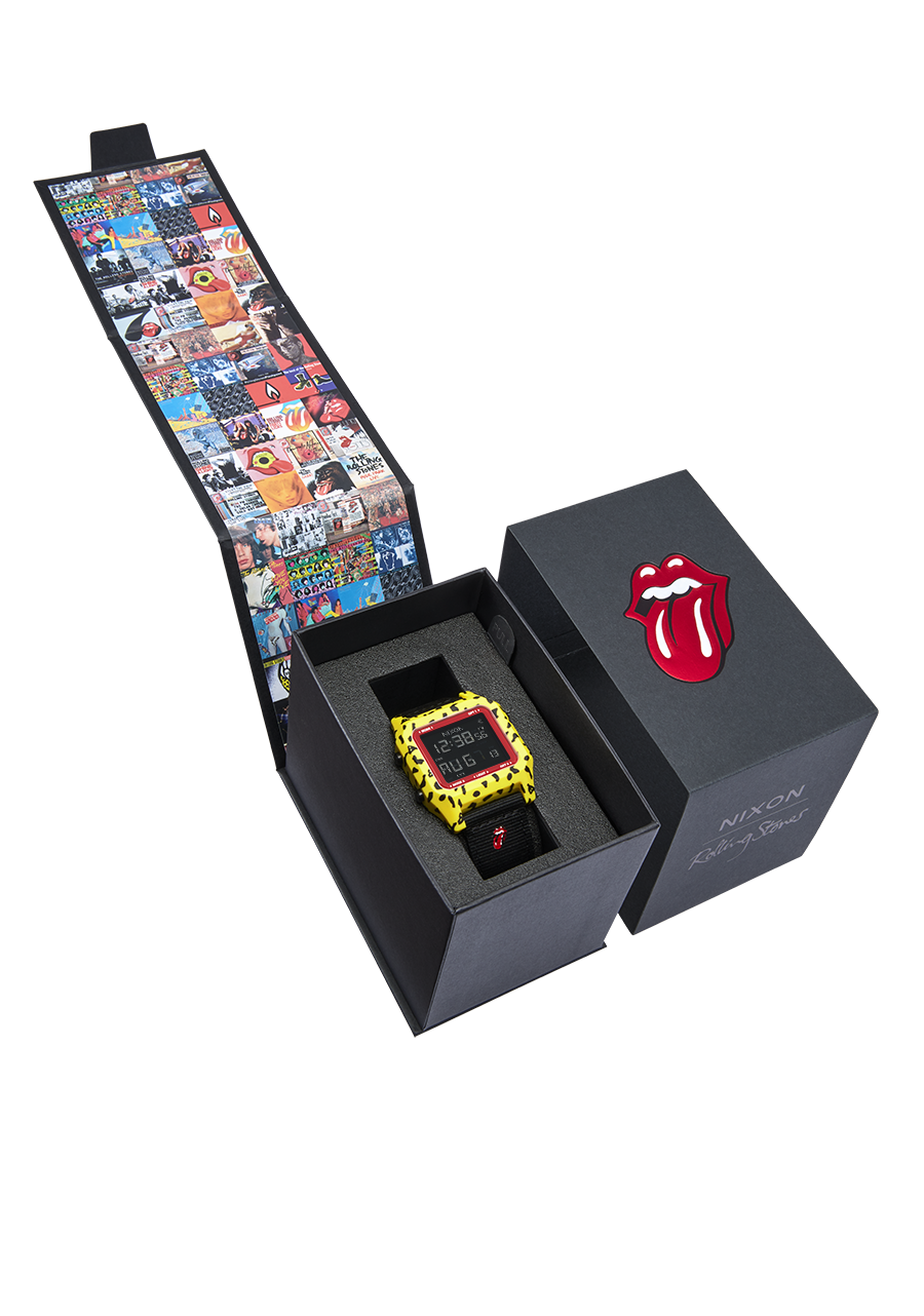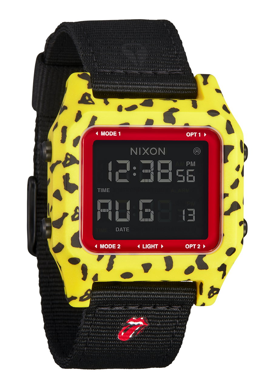 Una cassa gialla voodoo ispirata all'artwork dell'album degli Stones, mentre i doppi loghi Nixon e Stones adornano il cinturino orientato alle prestazioni. Le funzioni includono ora del giorno, giorno/data con calendario automatico fino al 2099, cronografo con risoluzione di 1/100 di secondo, timer, allarme e retroilluminazione EL. Il layout del display consente di visualizzare simultaneamente due funzioni a scelta.