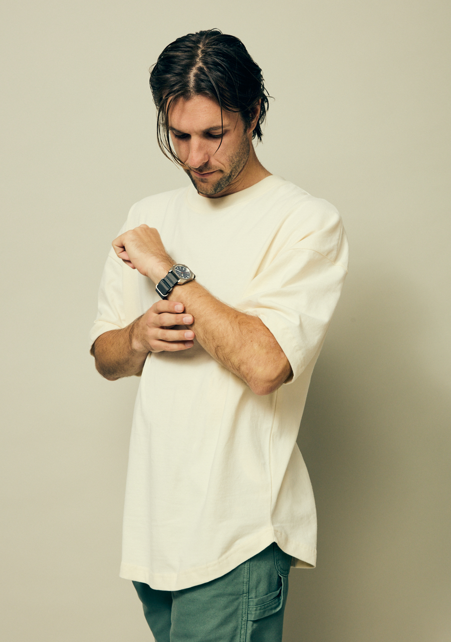 Il quadrante presenta indici arabi stampati con lancette dal design robusto riempite a contrasto.