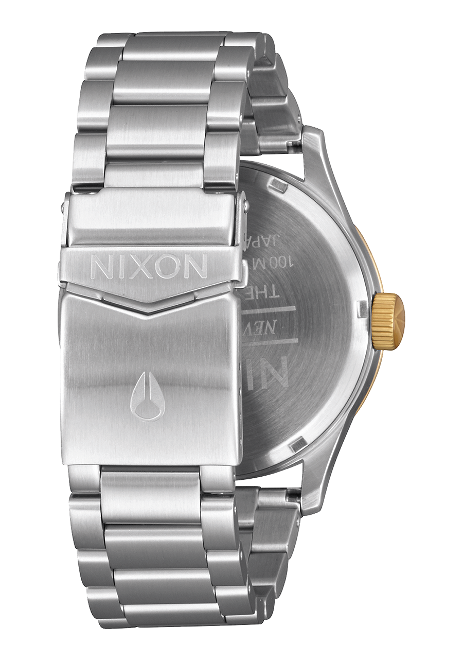 L'orologio Nixon Sentry in Acciaio Inox utilizza un movimento al quarzo Miyota 2305 giapponese a 3 lancette e presenta una funzione bilingue di giorno e data in inglese e spagnolo.