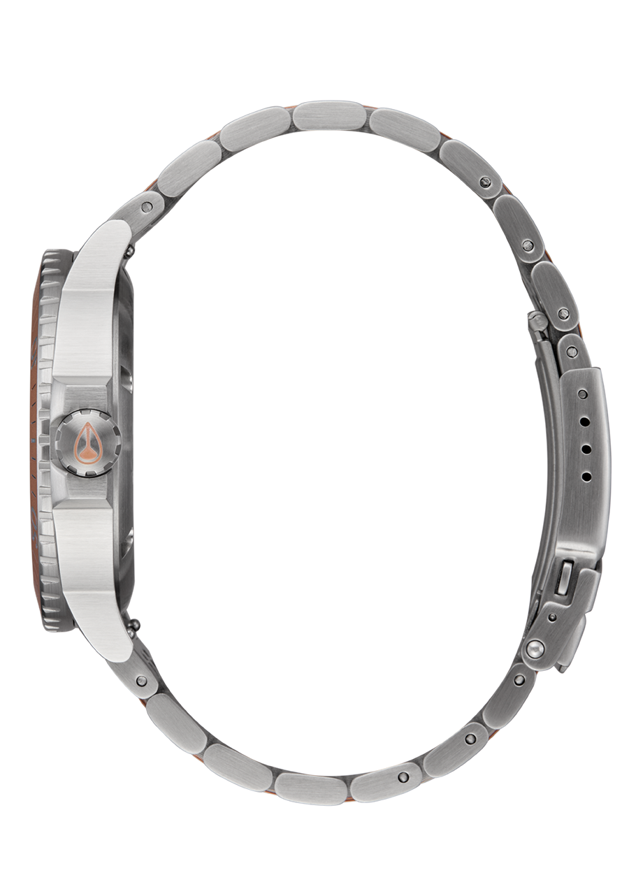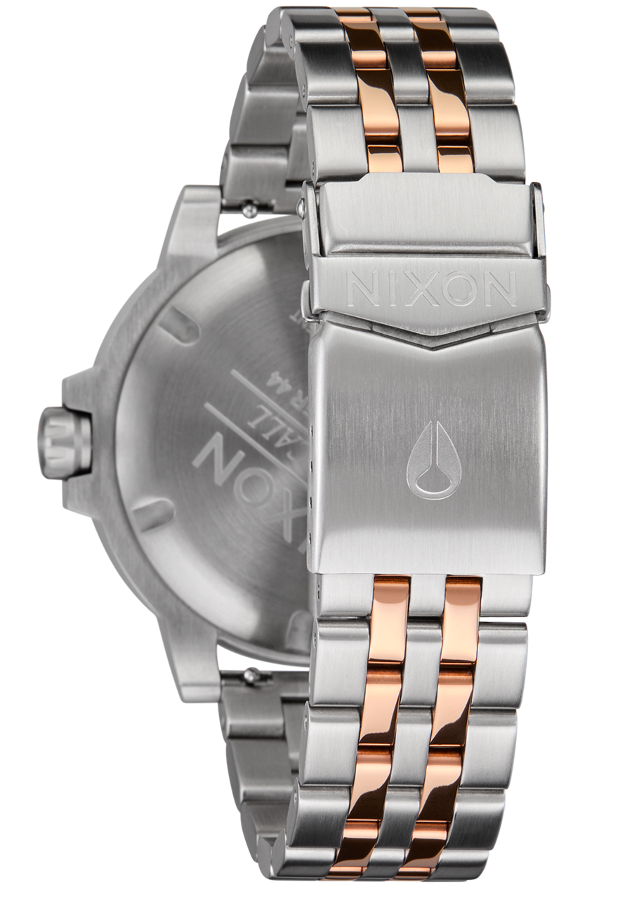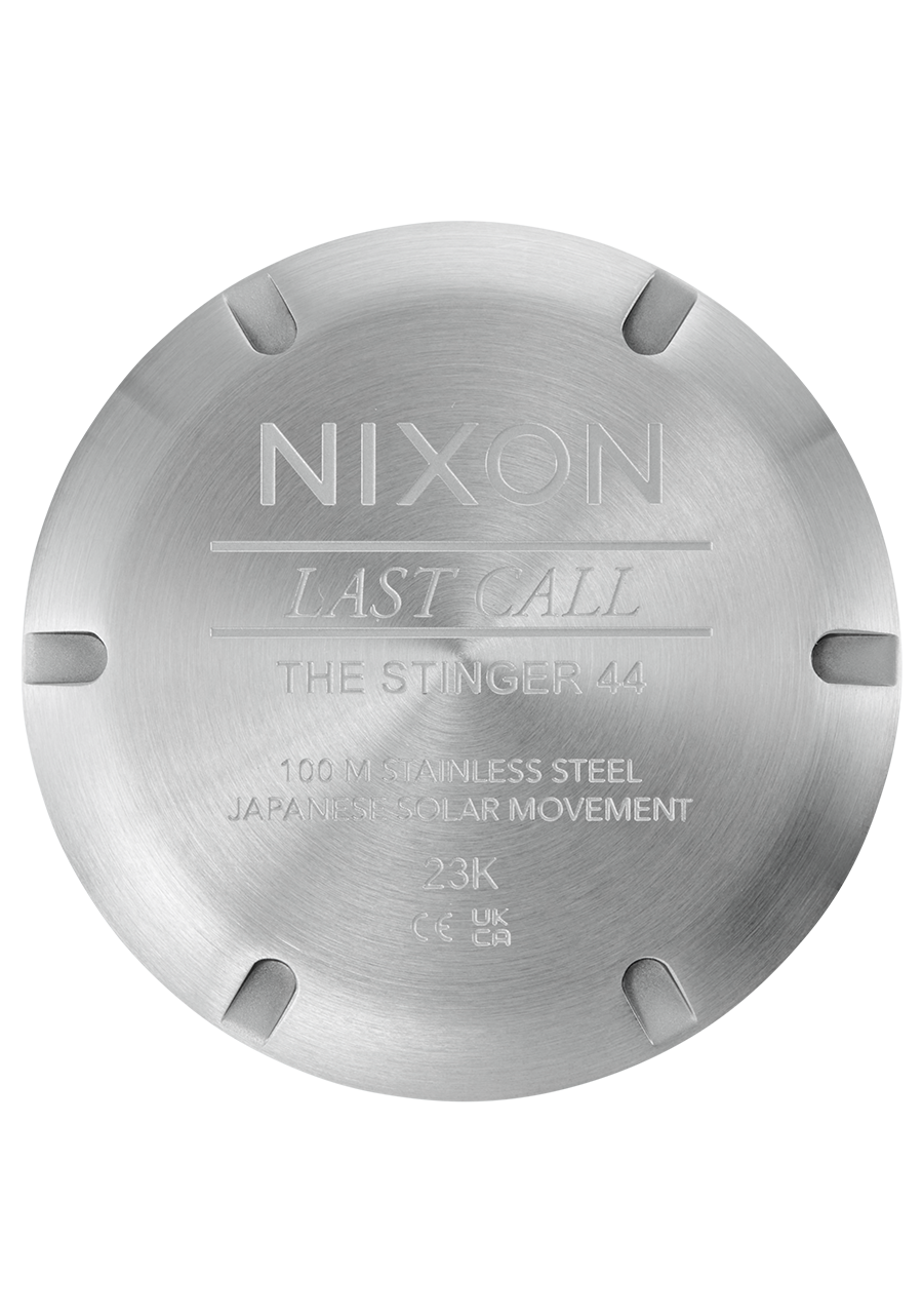 Cassa personalizzata in acciaio inossidabile massiccio da 44 mm e lunetta con conto alla rovescia, impermeabile fino a 100 metri / 10 ATM. Dotato di vetro minerale indurito, protezione della corona con corona in acciaio inossidabile a tripla guarnizione, fondello avvitato in acciaio inossidabile e anse con perni a molla.