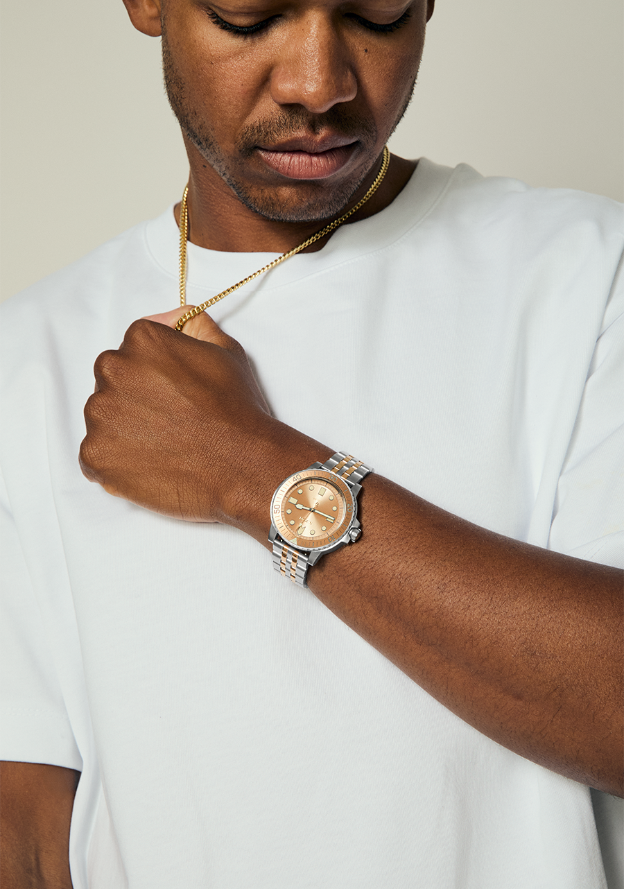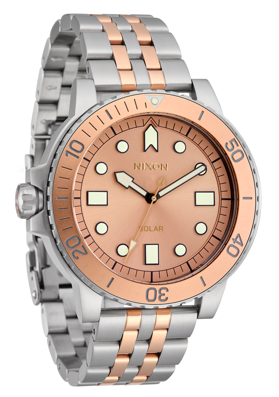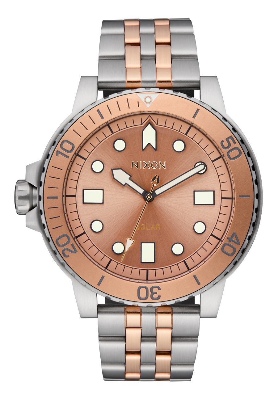 Cassa personalizzata in acciaio inossidabile massiccio da 44 mm e lunetta con conto alla rovescia, impermeabile fino a 100 metri / 10 ATM. Dotato di vetro minerale indurito, protezione della corona con corona in acciaio inossidabile a tripla guarnizione, fondello avvitato in acciaio inossidabile e anse con perni a molla.