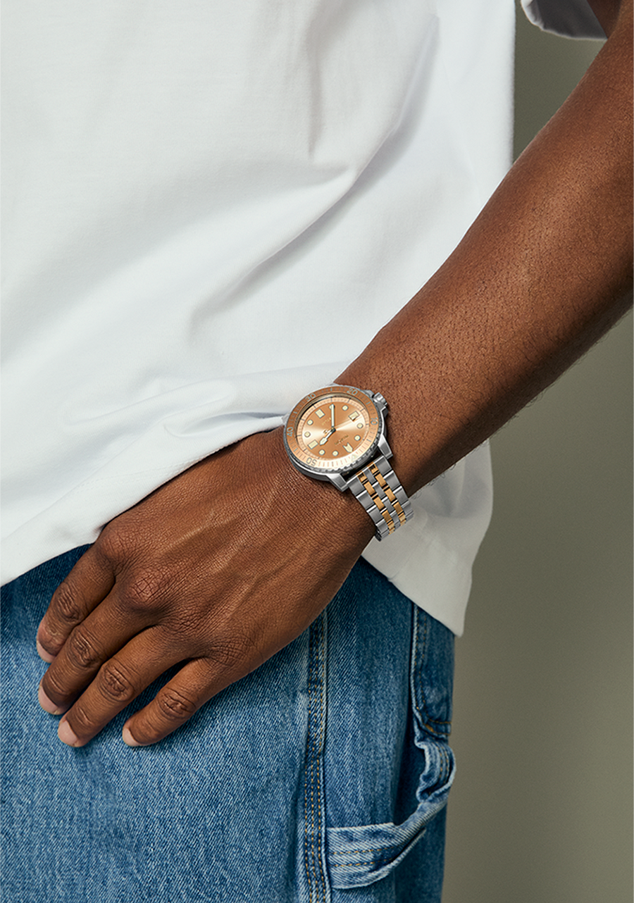 Il quadrante è circondato da una ghiera personalizzata con una scala dei secondi stampata, indici applicati in rilievo e lancette sagomate su misura. Il lume è applicato sugli indici e sulle lancette dell'orologio.