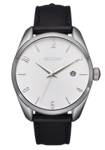 Cinturino per orologio in pelle personalizzato da 18mm con passante in acciaio inox personalizzato e fibbia con logo Nixon in rilievo.