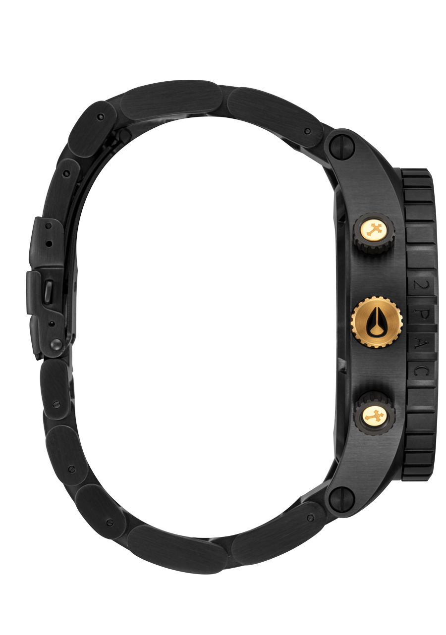 Die Krone und Drücker befinden sich auf der 9-Uhr-Seite des Gehäuses statt bei 3 Uhr, um "Handgelenksverletzungen" zu vermeiden, und die Drücker sind mit 2PAC-Ikonographie versehen. Eine einseitig drehbare Lünette für einen analogen Countdown-Timer. Sechs-Zeiger-Chronograph mit 24-Stunden- und Sekunden-Unterzifferblättern.