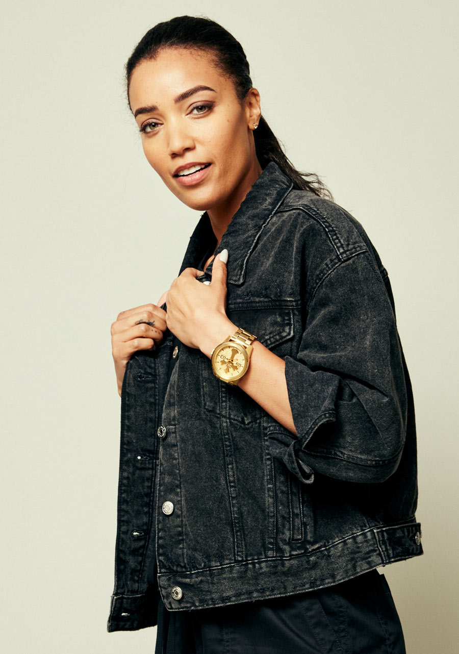 Eine maßgeschneiderte Münzrand-Lünette, die bündig zum Schutz des eingelassenen Glases angebracht ist, kombiniert mit einem glatt verarbeiteten Gehäuse. Fett gedruckte Schrift gemischt mit einer individuellen 2PAC-Ikonografie. Ein kunstvoll bedrucktes Zifferblatt mit Ziffern bei 9 und 3 Uhr sowie eine leicht zugängliche Krone für schnelle Einstellungen unterwegs.
