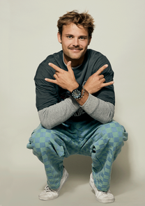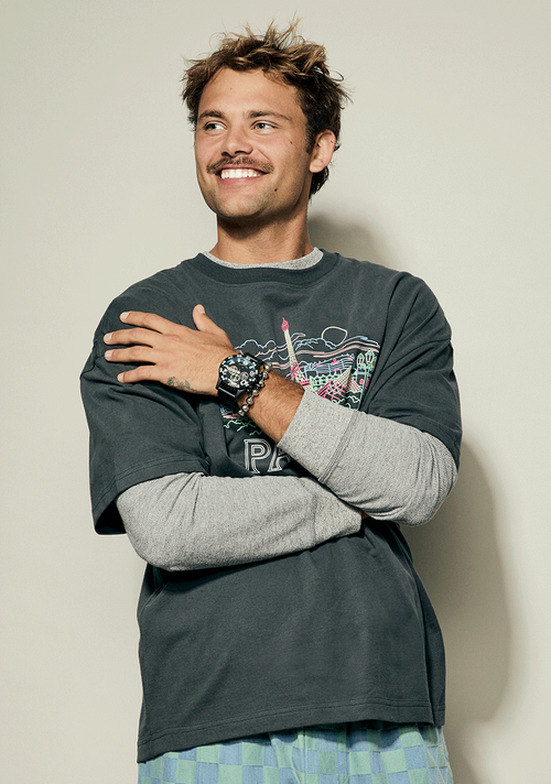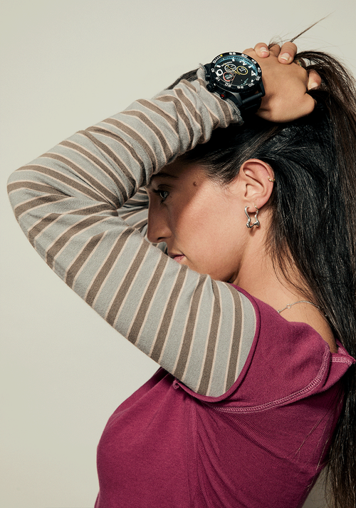 Die Krone und Drücker befinden sich auf der 9-Uhr-Seite des Gehäuses statt bei 3 Uhr, um ein Einschneiden am Handgelenk bei aktiver Nutzung zu verhindern. Sechs-Zeiger-Chronograph mit 24-Stunden- und Sekunden-Zähleranzeigen.