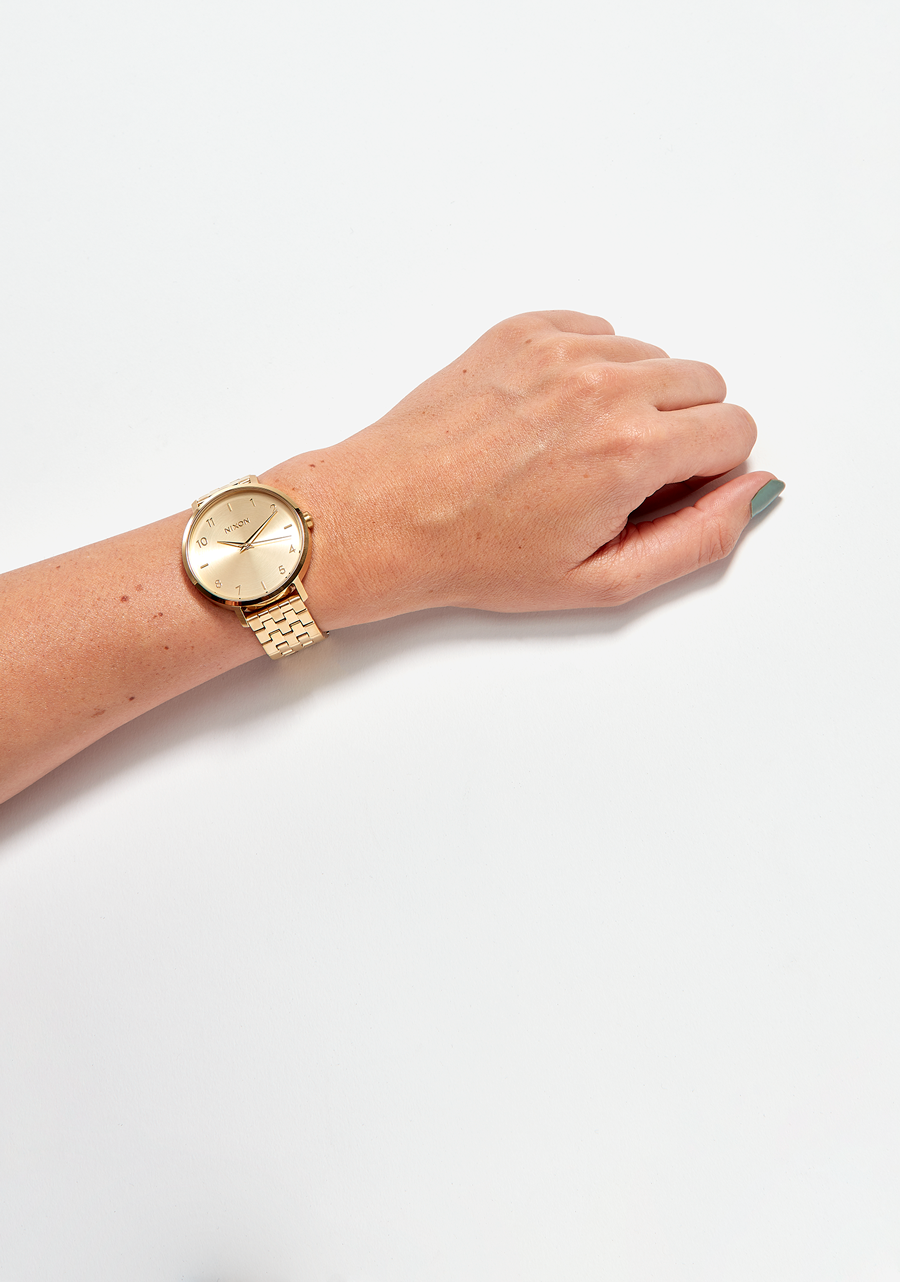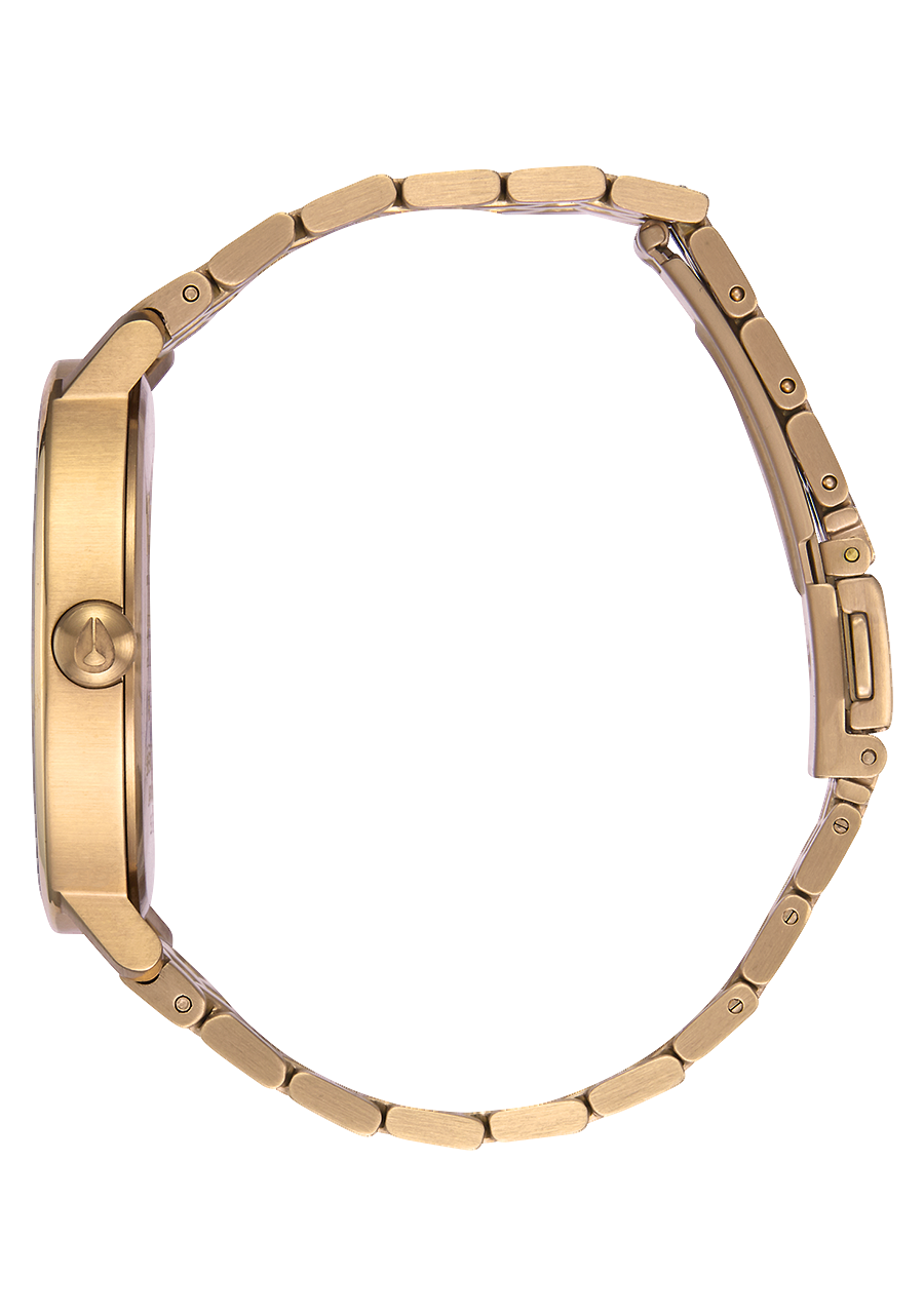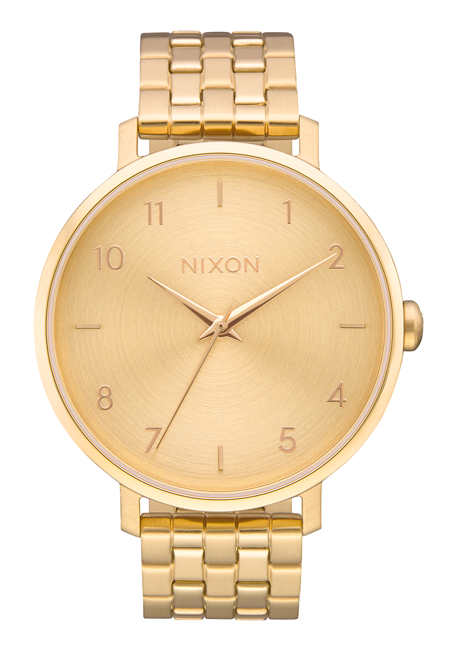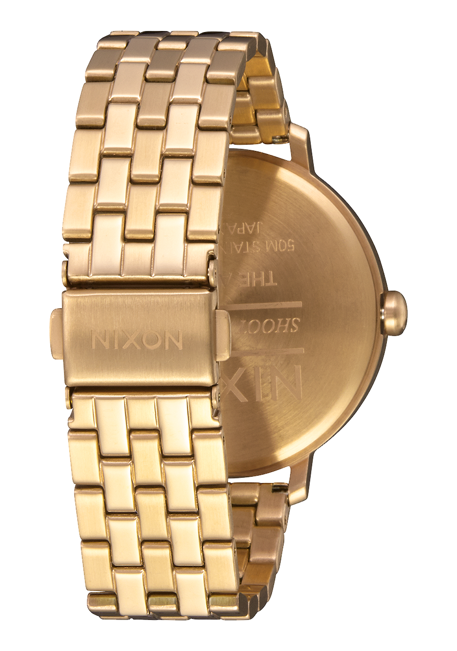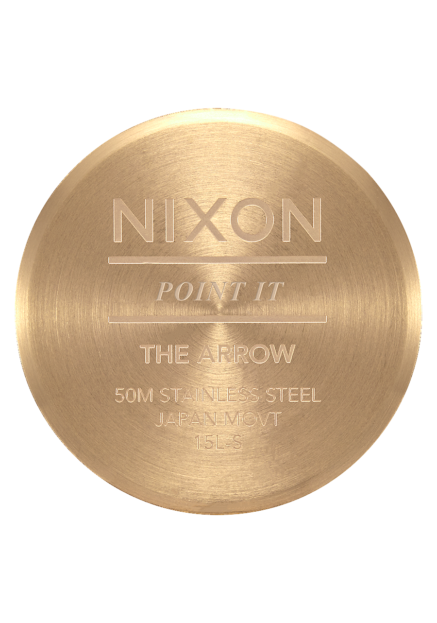 Zifferblatt mit aufgedrucktem Nixon-Schriftzug und Stundenmarkierungen in arabischer und Strichform. Ebenfalls mit gedruckten Zahlen und speziell geformten Zeigern ausgestattet.