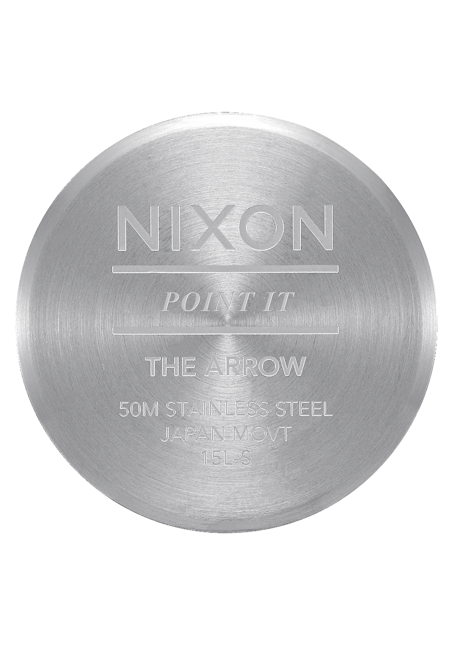 Dieses Zifferblatt enthält das applizierte Nixon-Logo und Stundenmarkierungen sowie gedruckte Zahlen und individuell geformte Zeiger.