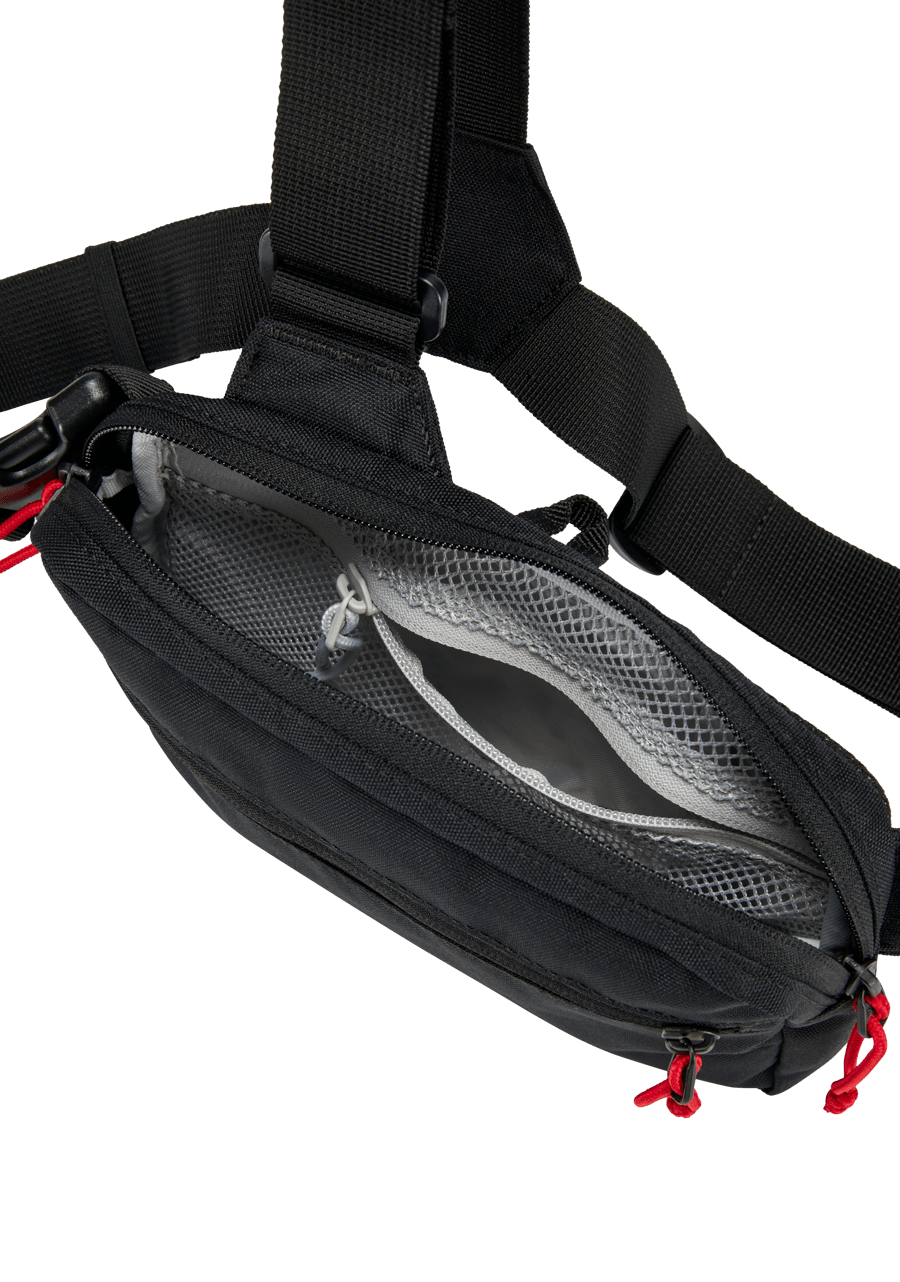 Atmungsaktives Netzgewebe auf der Rückseite ermöglicht Luftstrom und vermindert Schwitzen. Die Bandit-Tasche wird vor dem Körper getragen und ein zusätzlicher Hüftgurt sorgt für größere Sicherheit. Mit zahlreichen Reißverschlüssen innen und außen und mit Ordnungselementen innen wie Schlüsselclip und Schlupftaschen.