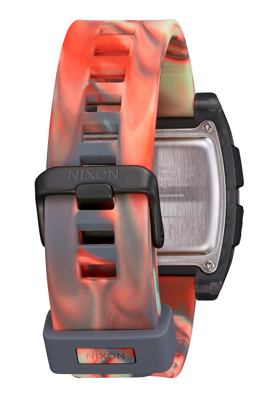 38 mm, 100 Meter/10 ATM, maßgefertigtes Spritzguss-TR90. Maßgefertigte, polycarbonatgedichtete Drücker, Edelstahl-Schraubboden und Edelstahl-Schraubstegösen.