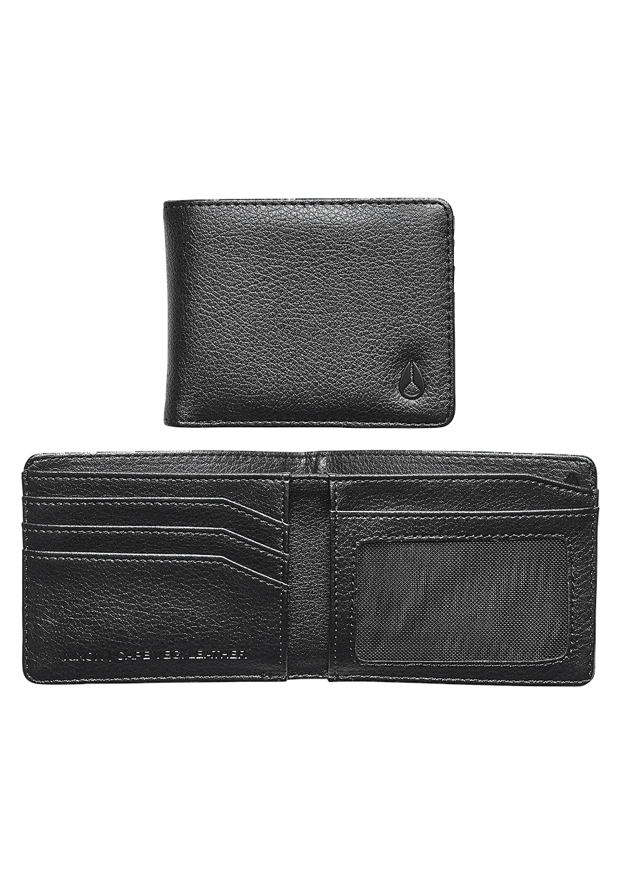 Portemonnaie aus veganem Leder mit geprägtem Inneren. Leicht zugängliches Geldscheinfach, Ausweisfenster aus Mesh und spezielle Logoniete aus Metall vorne.